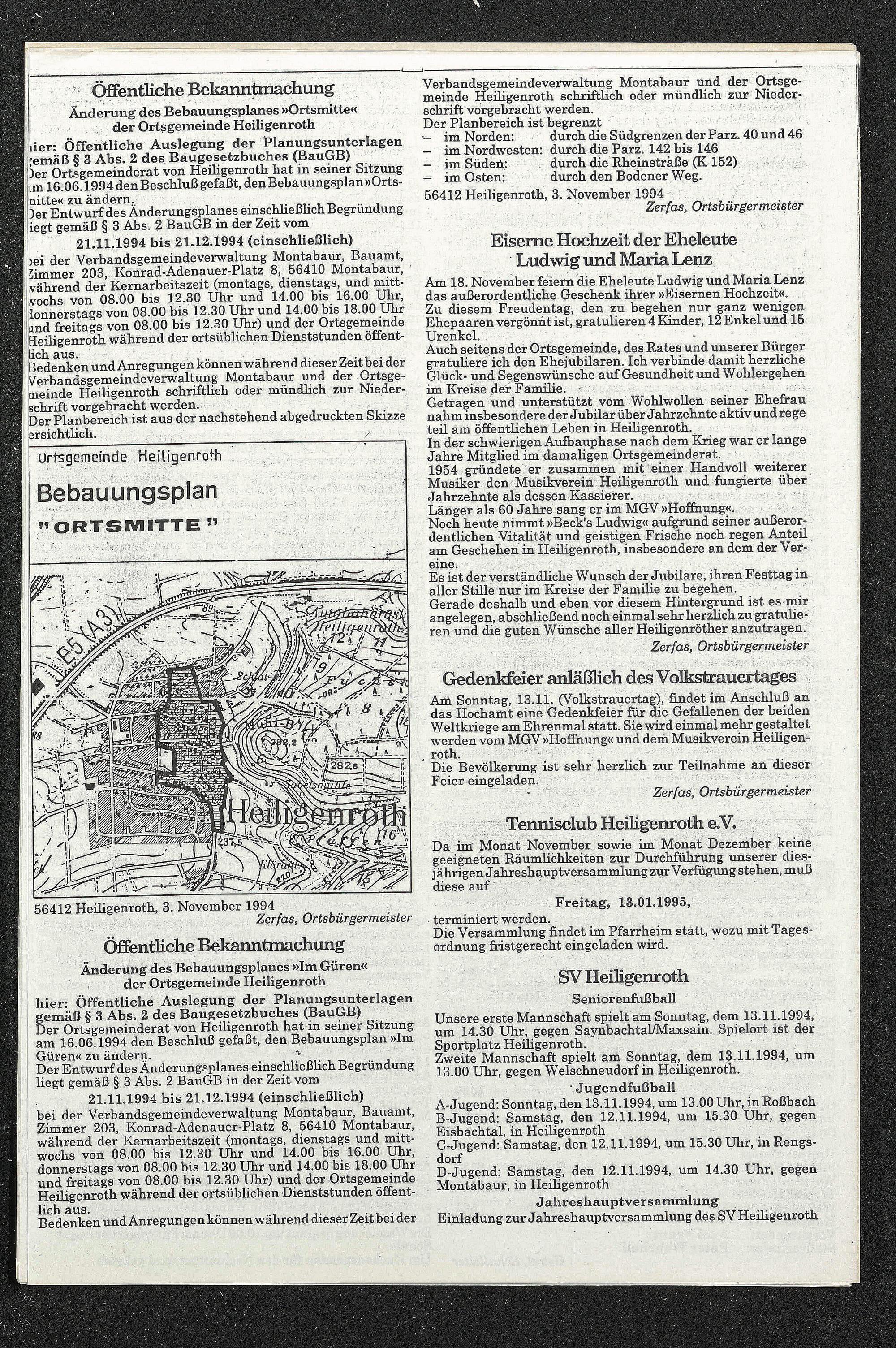21.11.1994 bis 21.12.1994 (einschließlich) bei der Verbandsgemeindeverwaltung Montabaur, Bauamt, Zimmer 203, Konrad-Adenauer-Platz 8, 56410 Montabaur, während der Kernarbeitszeit (montags, dienstags und mittwochs von 08.00 bis 12.30 Uhr und 14.00 bis 16.00 Uhr, donnerstags von 08.00 bis 12.30 Uhr und 14.00 bis 18.00 Uhr und freitags von 08.00 bis 12.30 Uhr) und der Ortsgemeinde Heiligenroth während der ortsüblichen Dienststunden öffentlich aus.