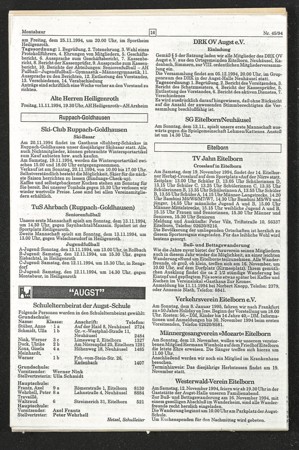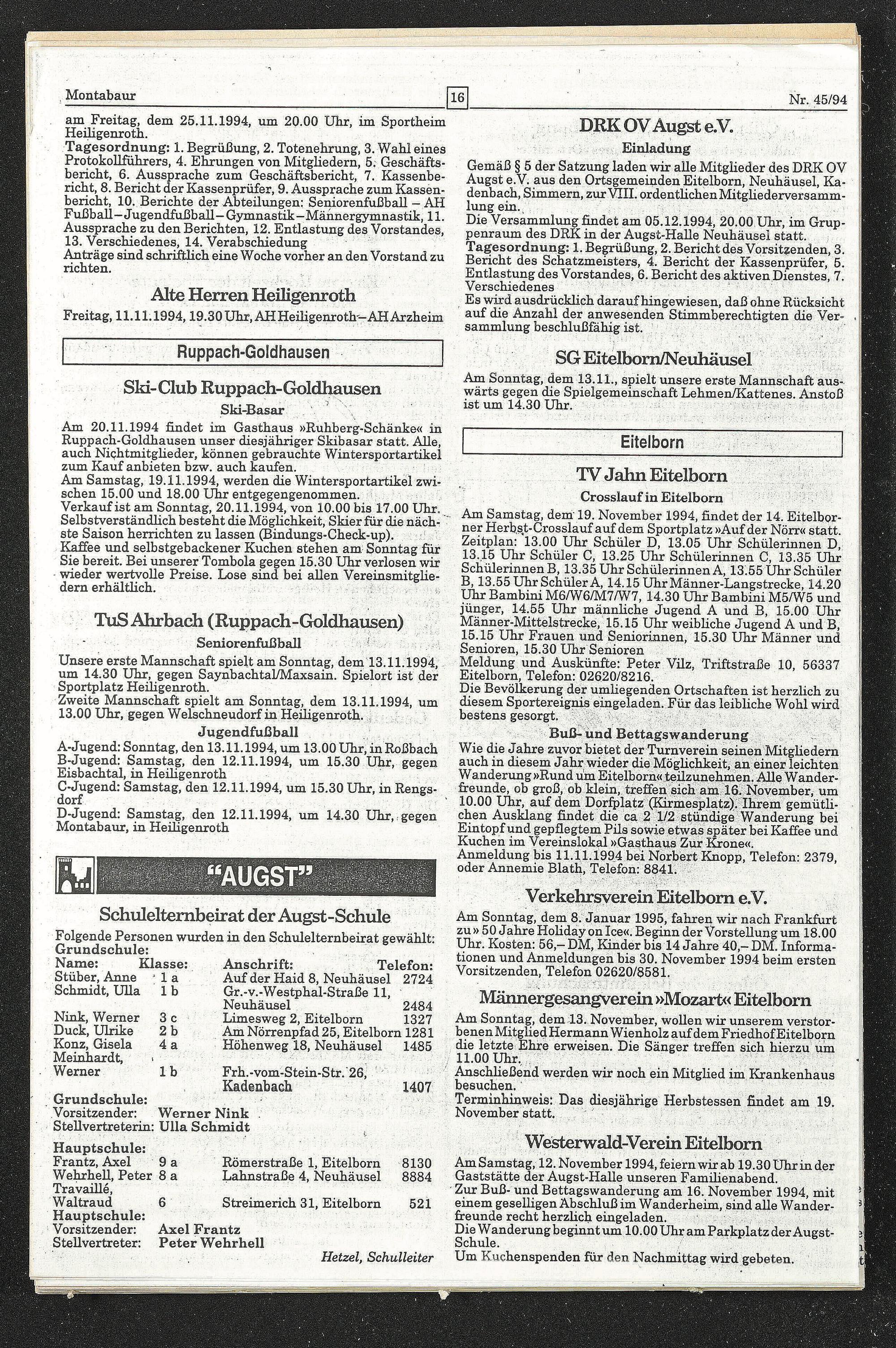 Am Samstag, dem' 19. November 1994, findet der 14. Eitelbor- ner Herbst-Crosslauf auf dem Sportplatz »Auf der Nörr« statt. Zeitplan: 13.00 Uhr Schüler D, 13.05 Uhr Schülerinnen D,