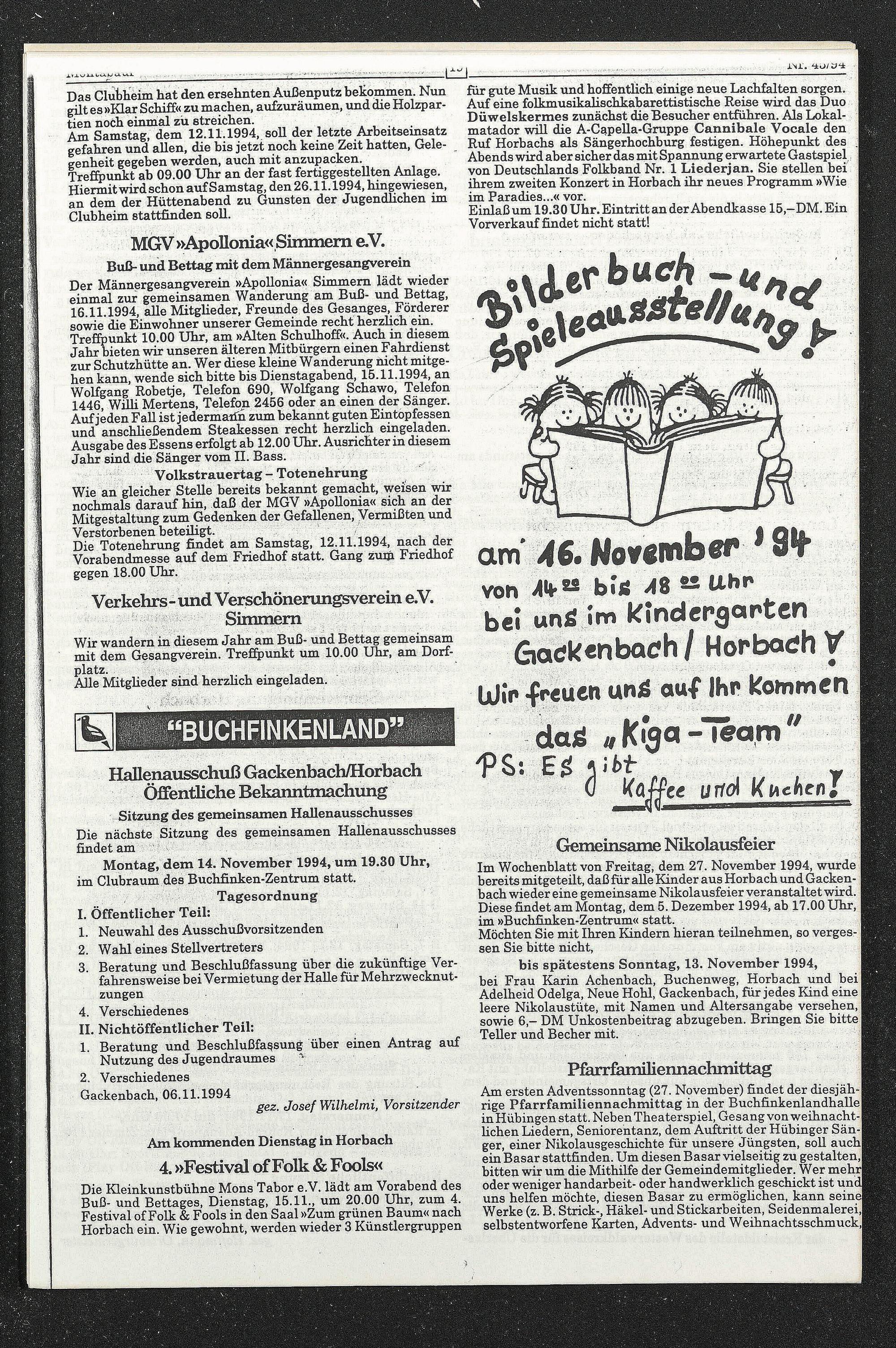 Im Wochenblatt von Freitag, dem 27. November 1994, wurde bereits mitgeteilt, daß für alle Kinder aus Horbach und Gackenbach wieder eine gemeinsame Nikolausfeier veranstaltet wird. Diese findet am Montag, dem 5. Dezember 1994, ab 17.00 Uhr, im »Buchfinken-Zentrum« statt.