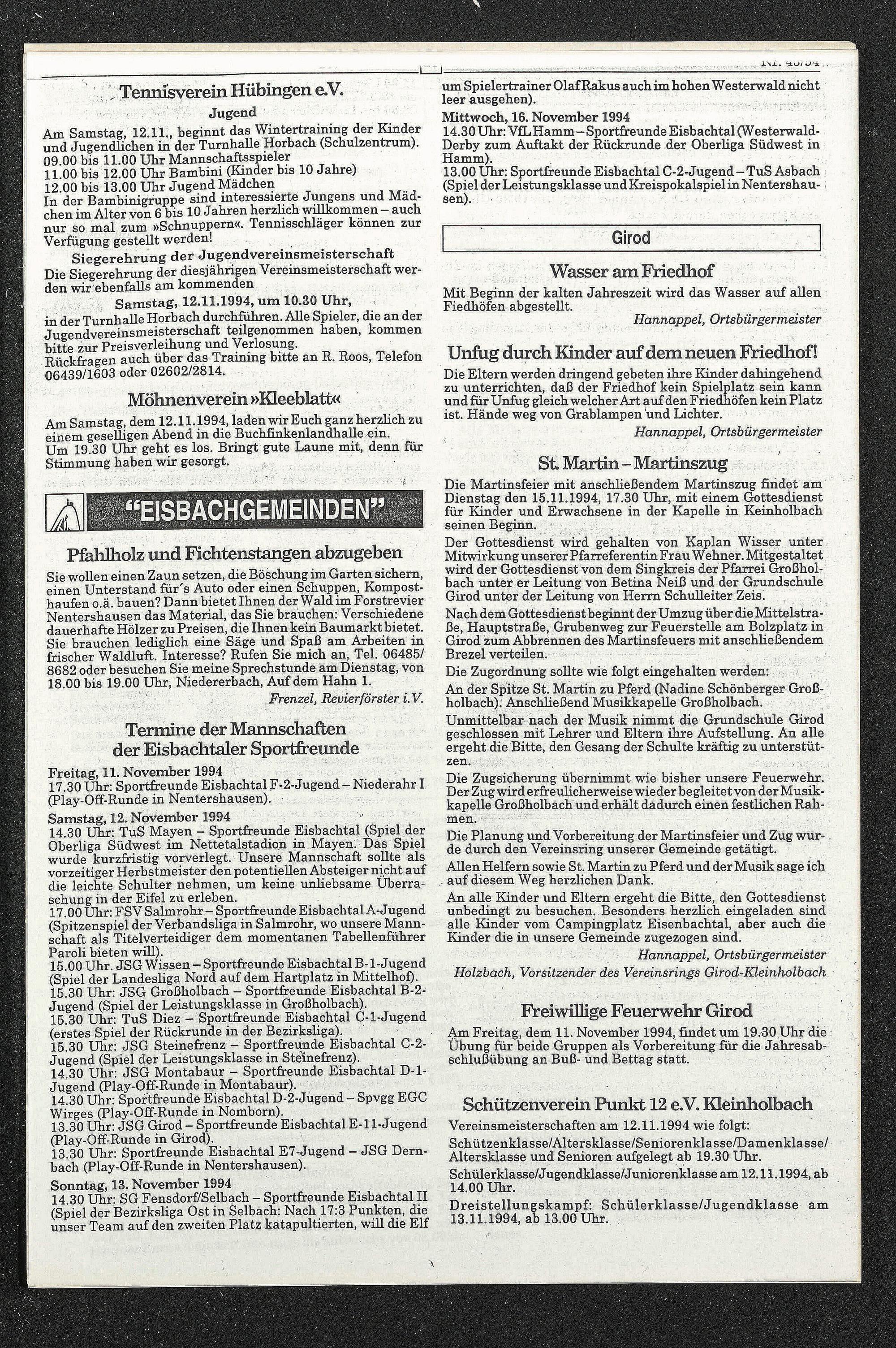 Die Martinsfeier mit anschließendem Martinszug findet am Dienstag den 15.11.1994, 17.30 Uhr, mit einem Gottesdienst für Kinder und Erwachsene in der Kapelle in Keinholbach seinen Beginn.