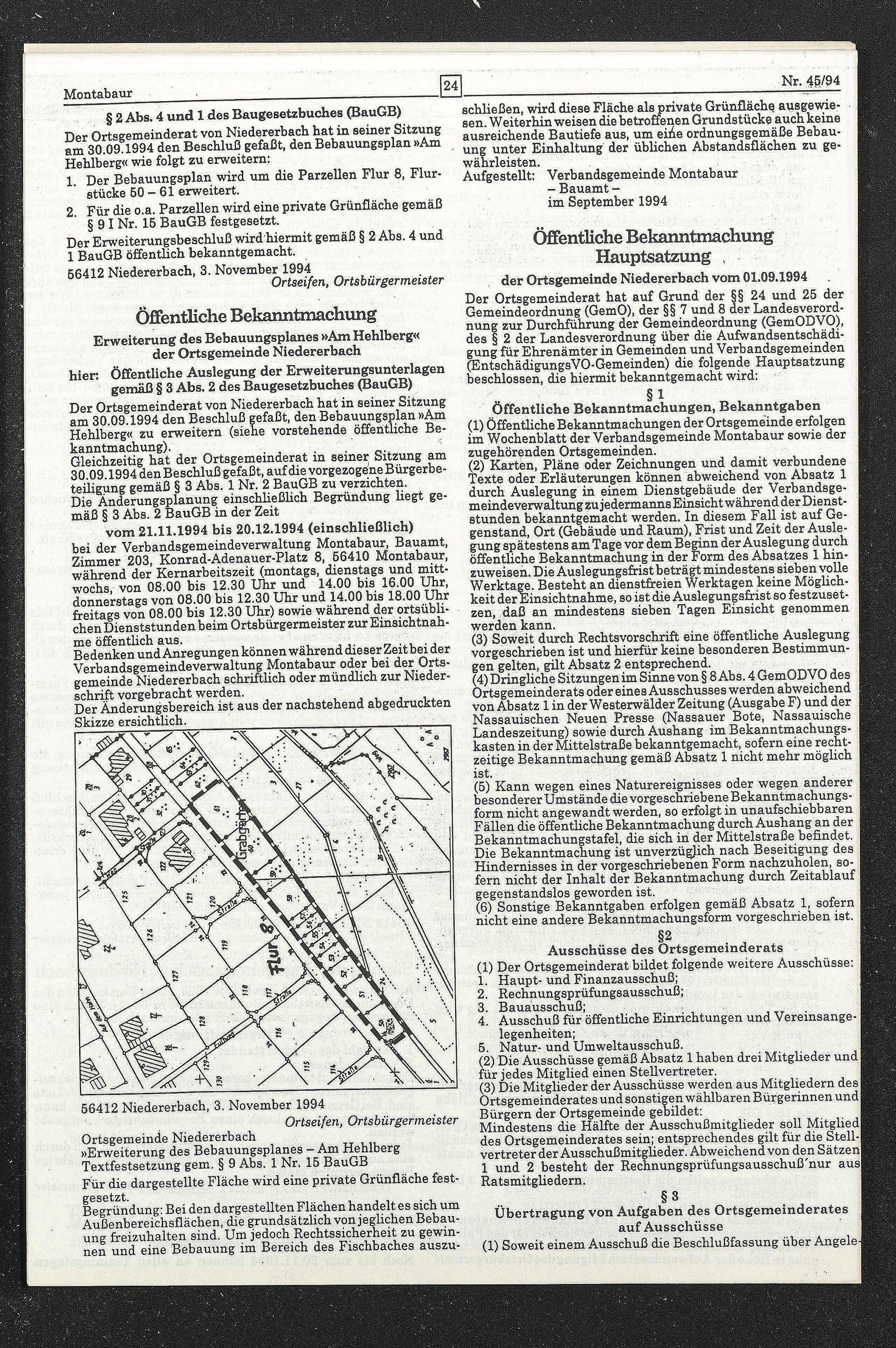 Der Ortsgemeinderat von Niedererbach hat in seiner Sitzung am 30.09.1994 den Beschluß gefaßt, den Bebauungsplan »Am Hehlberg« zu erweitern (siehe vorstehende öffentliche Bekanntmachung).