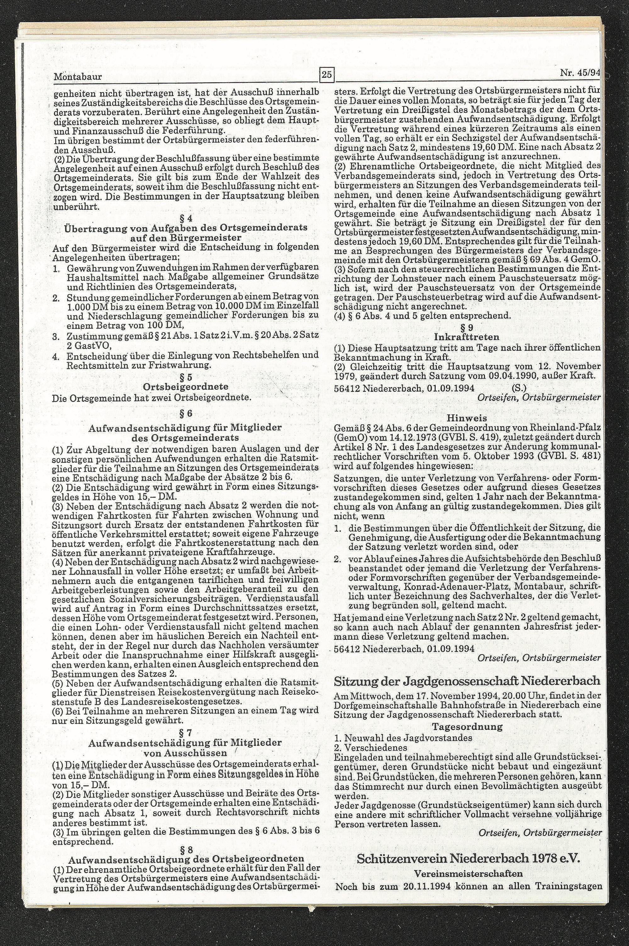 Am Mittwoch, dem 17. November 1994,20.00 Uhr, findetin der ? Dorfgemeinschaftshalle Bahnhofstraße in Niedererbach eine Sitzung der Jagdgenossenschaft Niedererbach statt. :