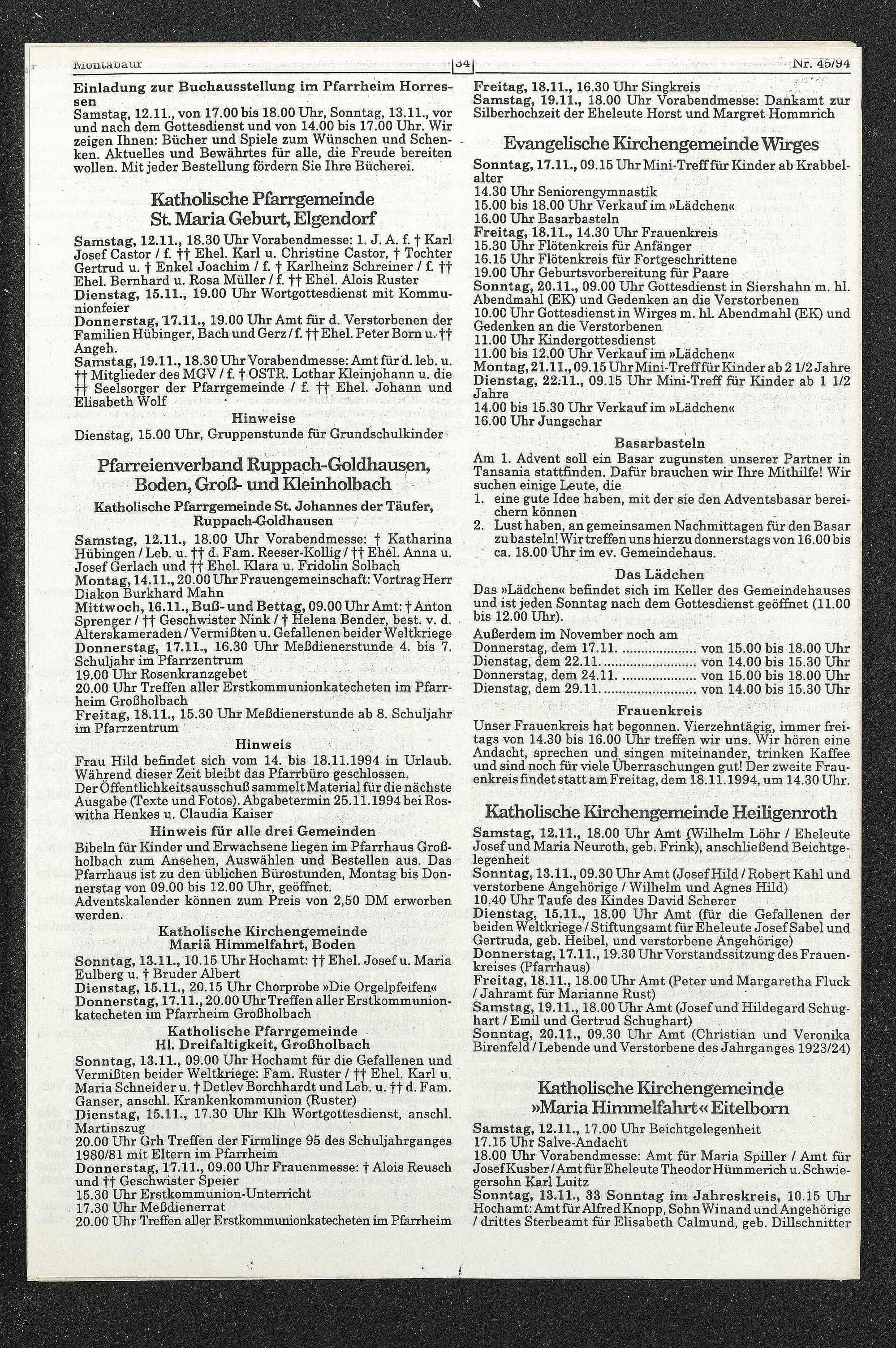 Frau Hild befindet sich vom 14. bis 18.11.1994 in Urlaub. Während dieser Zeit bleibt das Pfarrbüro geschlossen.