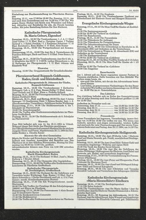 Samstag, 19.11., 18.30 Uhr Vorabendmesse: Amt für'd. leb. u. ff Mitglieder des MGV / f. f OSTR. Lothar Kleinjohann u. die ff Seelsorger der Pfarrgemeinde / f. tt Ehel. Johann und Elisabeth Wolf ■