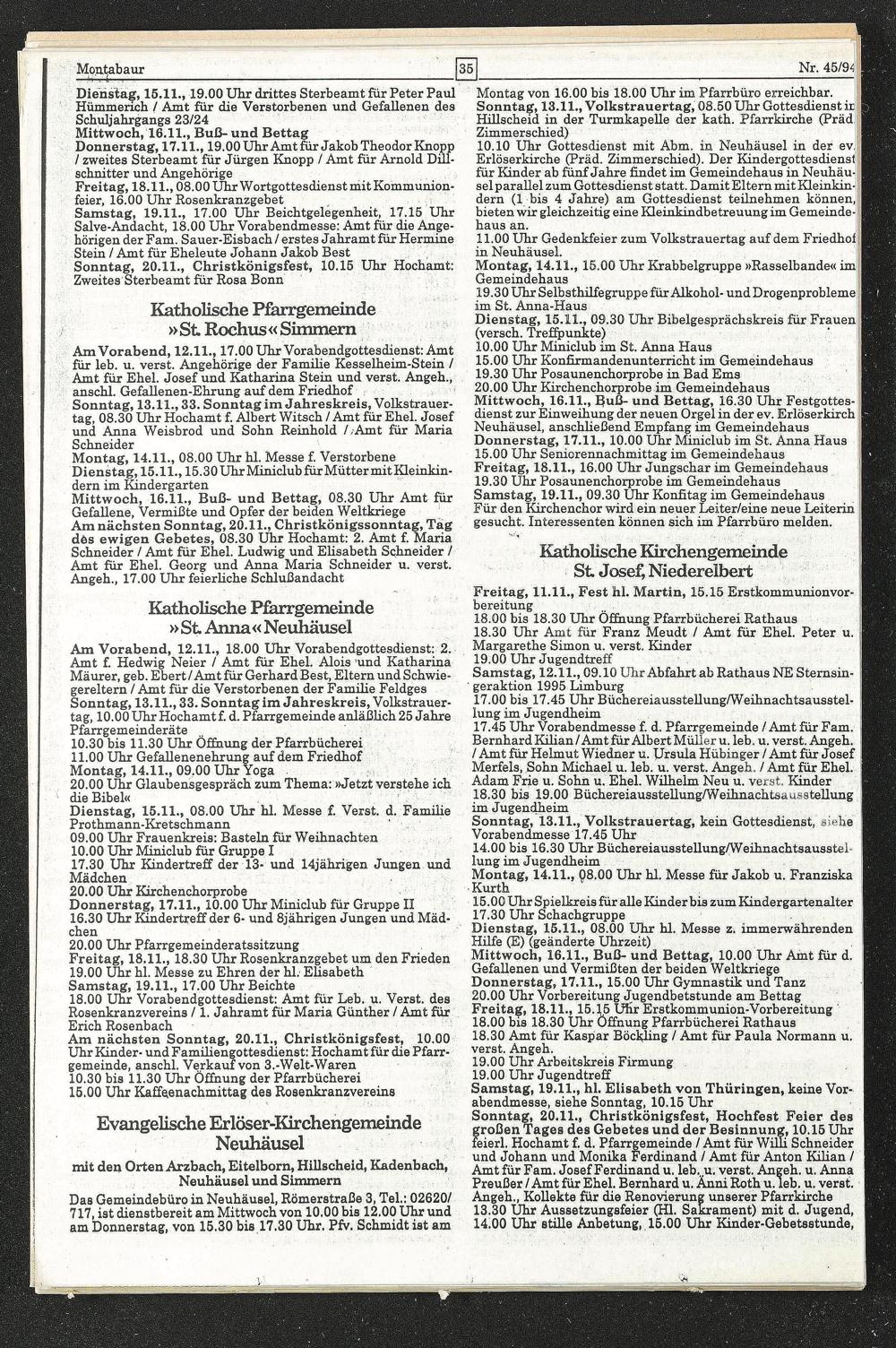 Am Vorabend, 12.11., 18.00 Uhr Vorabendgottesdienst: 2. Amt. £ Hedwig Neier / Amt für Ehel. Alois 'und Katharina Maurer, geb. Ebert / Amt für Gerhard Best, Eltern und Schwiegereltern / Amt für die Verstorbenen der Familie Feldges Sonntag, 13.11., 33. Sonntag im Jahreskreis, Volkstrauertag, 10.00 Uhr Hochamtf. d. Pfarrgemeinde anläßlich 25 Jahre Pfarrgemeinderäte