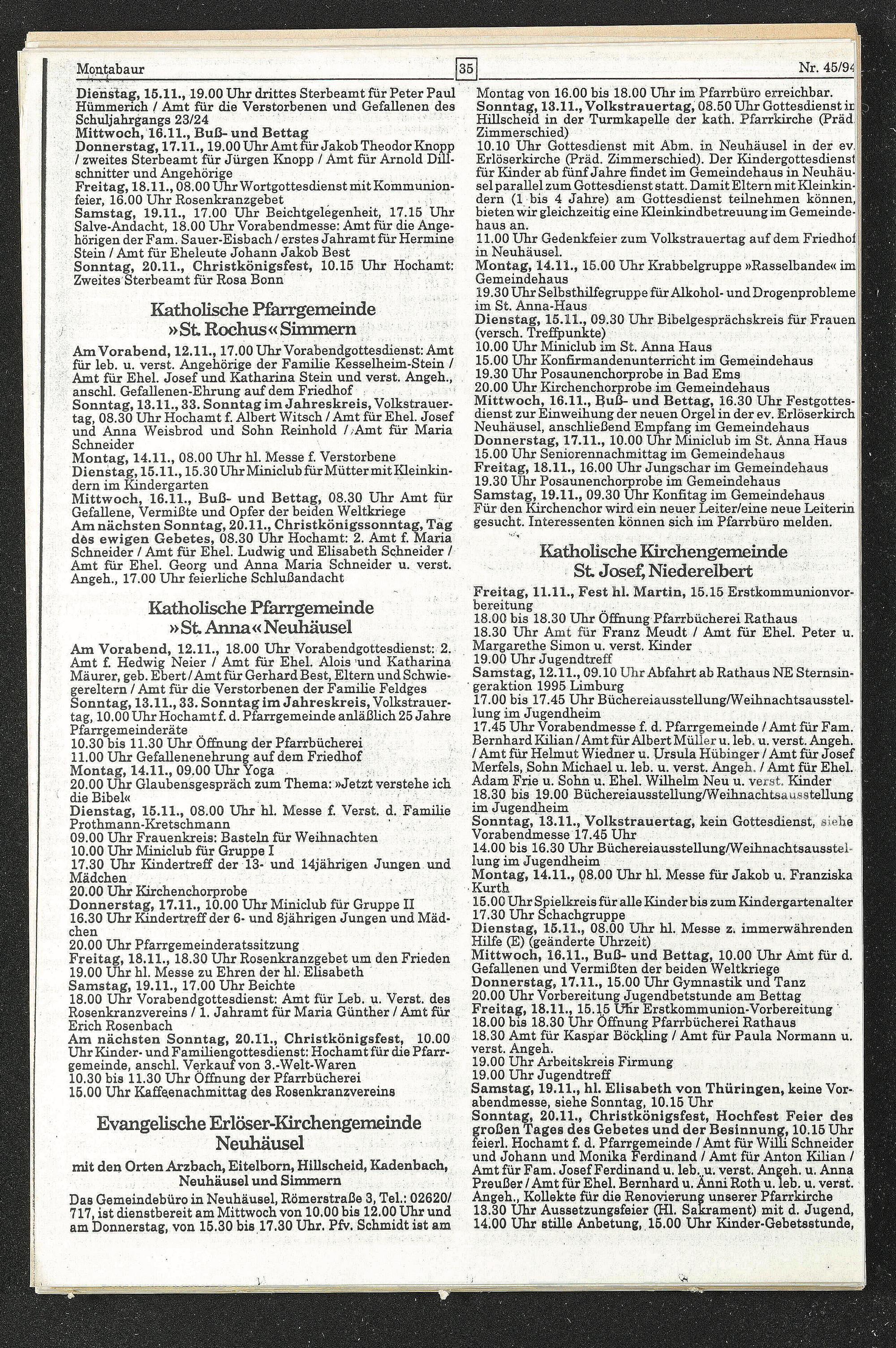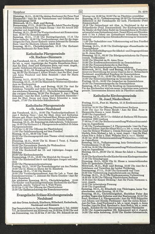 Mittwoch, 16.11., Buß- und Bettag, 08.30 Uhr Amt für Gefallene, Vermißte und Opfer der beiden Weltkriege Am nächsten Sonntag, 20.11., Christkönigssonntag, Tag dös ewigen Gebetes, 08.30 Uhr Hochamt: 2. Amt f. Maria Schneider / Amt für Ehel. Ludwig und Elisabeth Schneider / Amt, für Ehel. Georg und Anna Maria Schneider u. verst. Angeh., 17.00 Uhr feierliche Schlußandacht