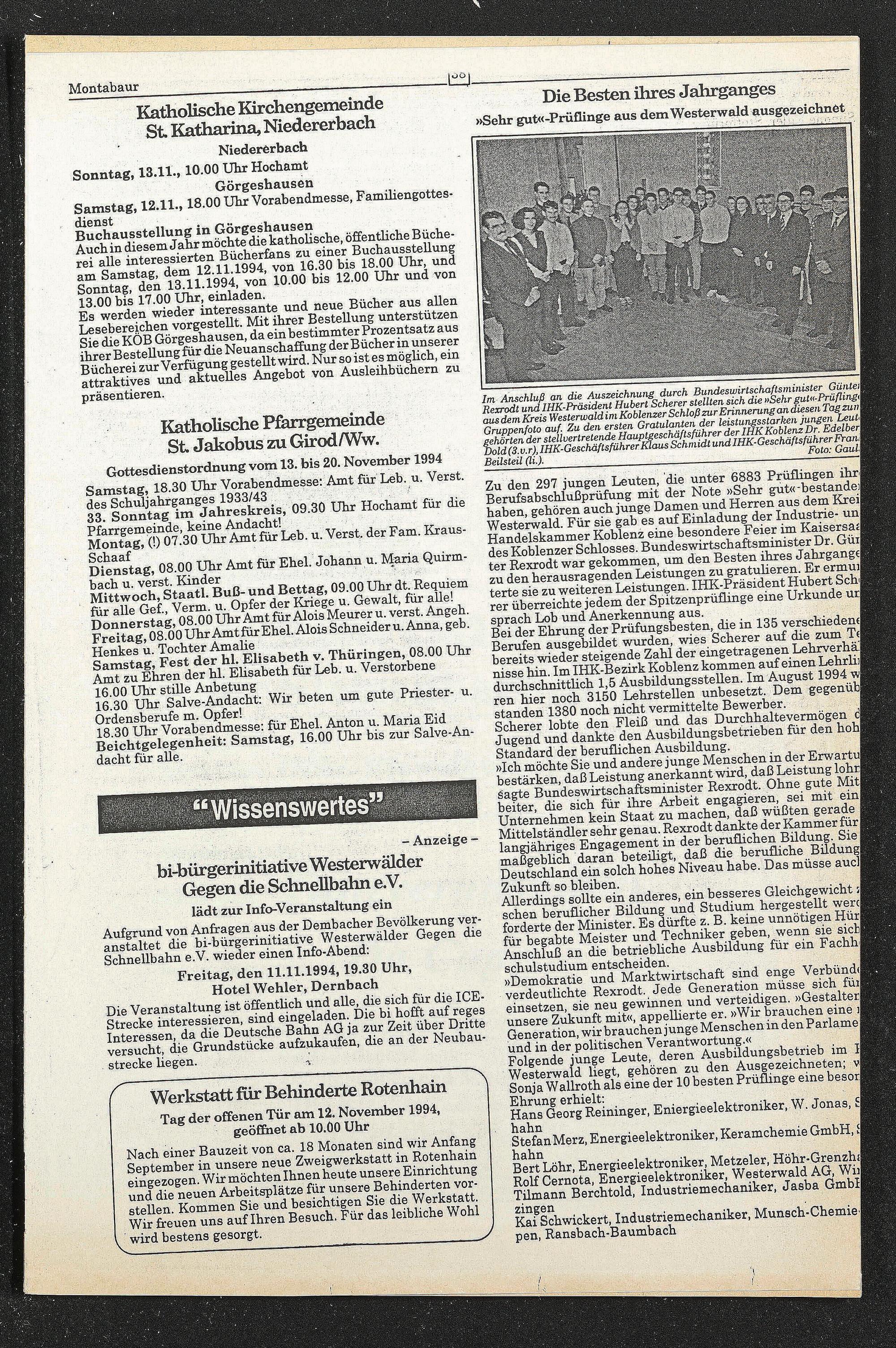 Bei der Ehrung der Prüfungsbesten, die in 135 verschieden«! Berufen ausgebildet wurden, wies Scherer auf die zum T« bereits wieder steigende Zahl der eingetragenen Lehrverhaj nisse hin. Im IHK-Bezirk Koblenz kommen auf einen Lehrliij durchschnittlich 1,5 Ausbildungsstellen. Im August 1994 wl ren hier noch 3150 Lehrstellen unbesetzt. Dem gegenübj standen 1380 noch nicht vermittelte Bewerber.