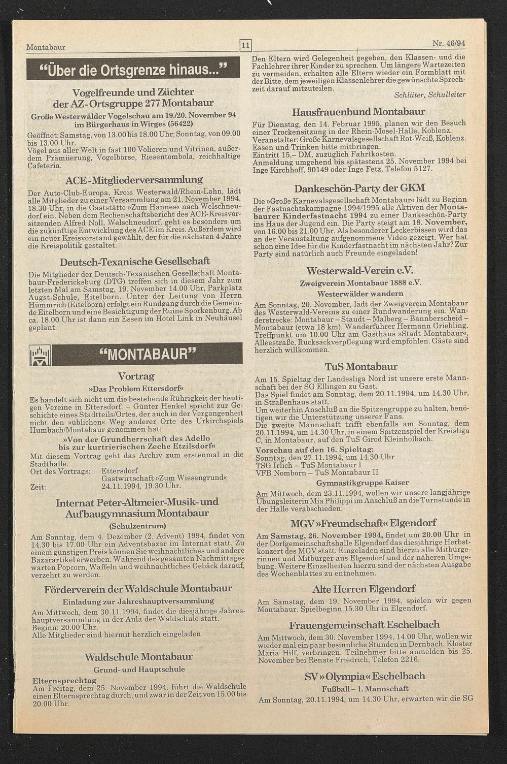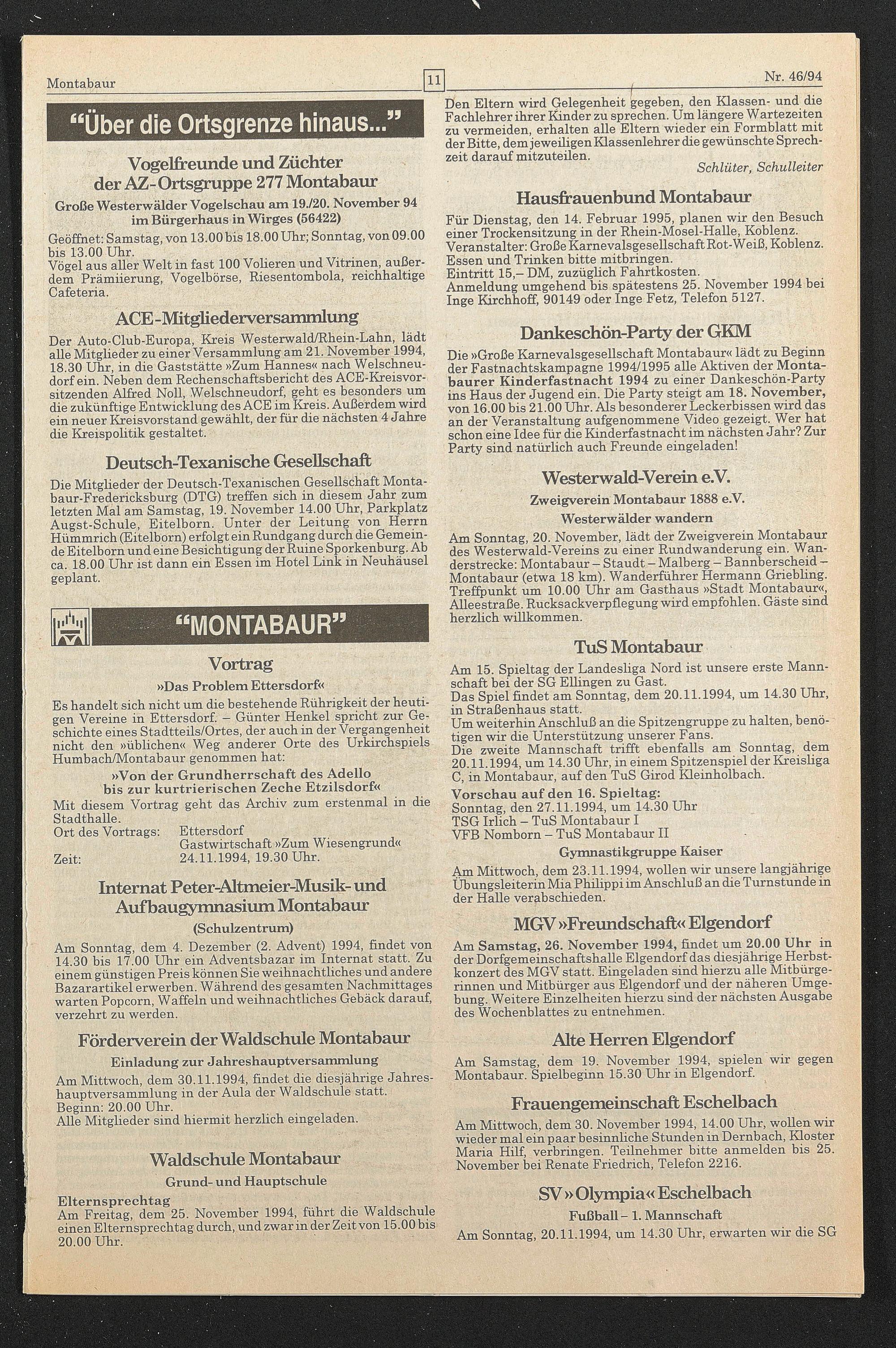 Am Samstag, dem 19. November 1994, spielen wir gegen Montabaur. Spielbeginn 15.30 Uhr in Eigendorf.