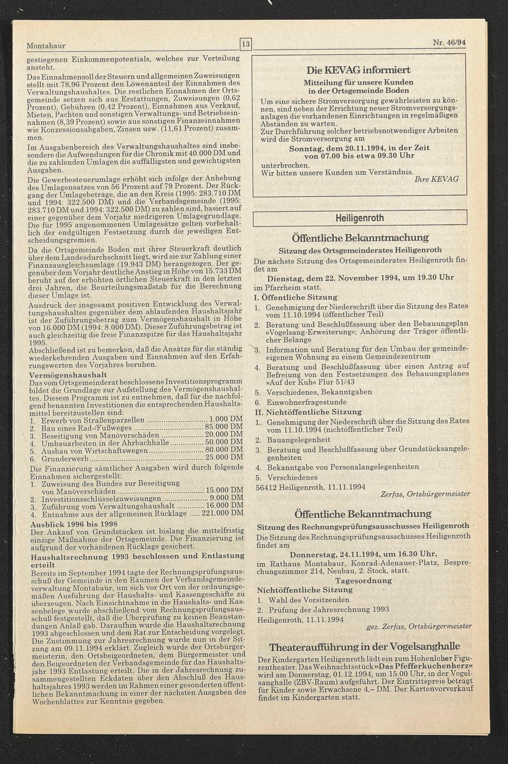 2. Prüfung der Jahresrechnung 1993 Heiligenroth, 11.11.1994