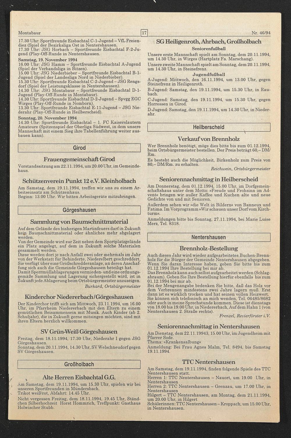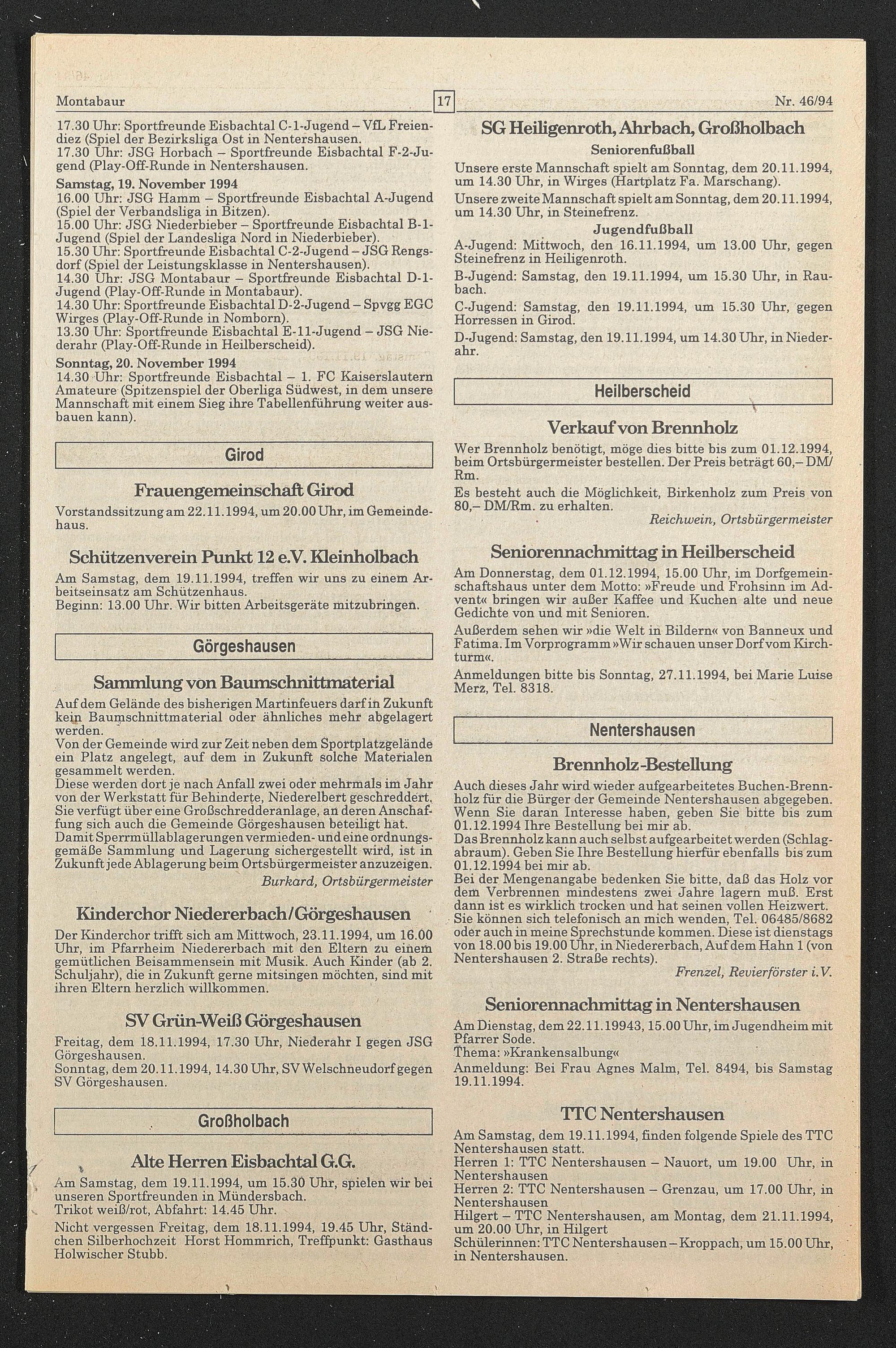 Wer Brennholz benötigt, möge dies bitte bis zum 01.12.1994, beim Ortsbürgermeister bestellen. Der Preis beträgt 60,- DM/ Rm.