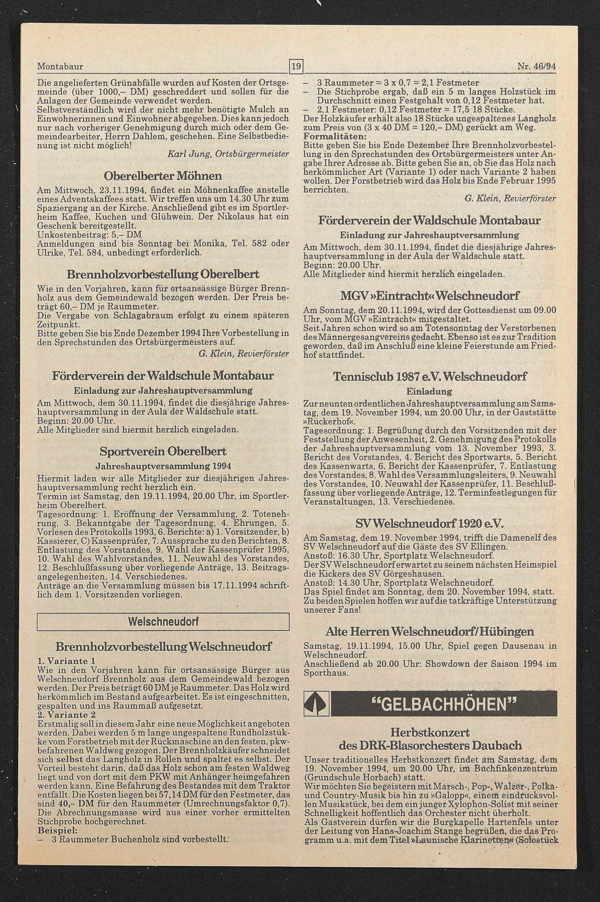 Termin ist Samstag, den 19.11.1994, 20.00 Uhr, im Sportlerheim Oberelbert.