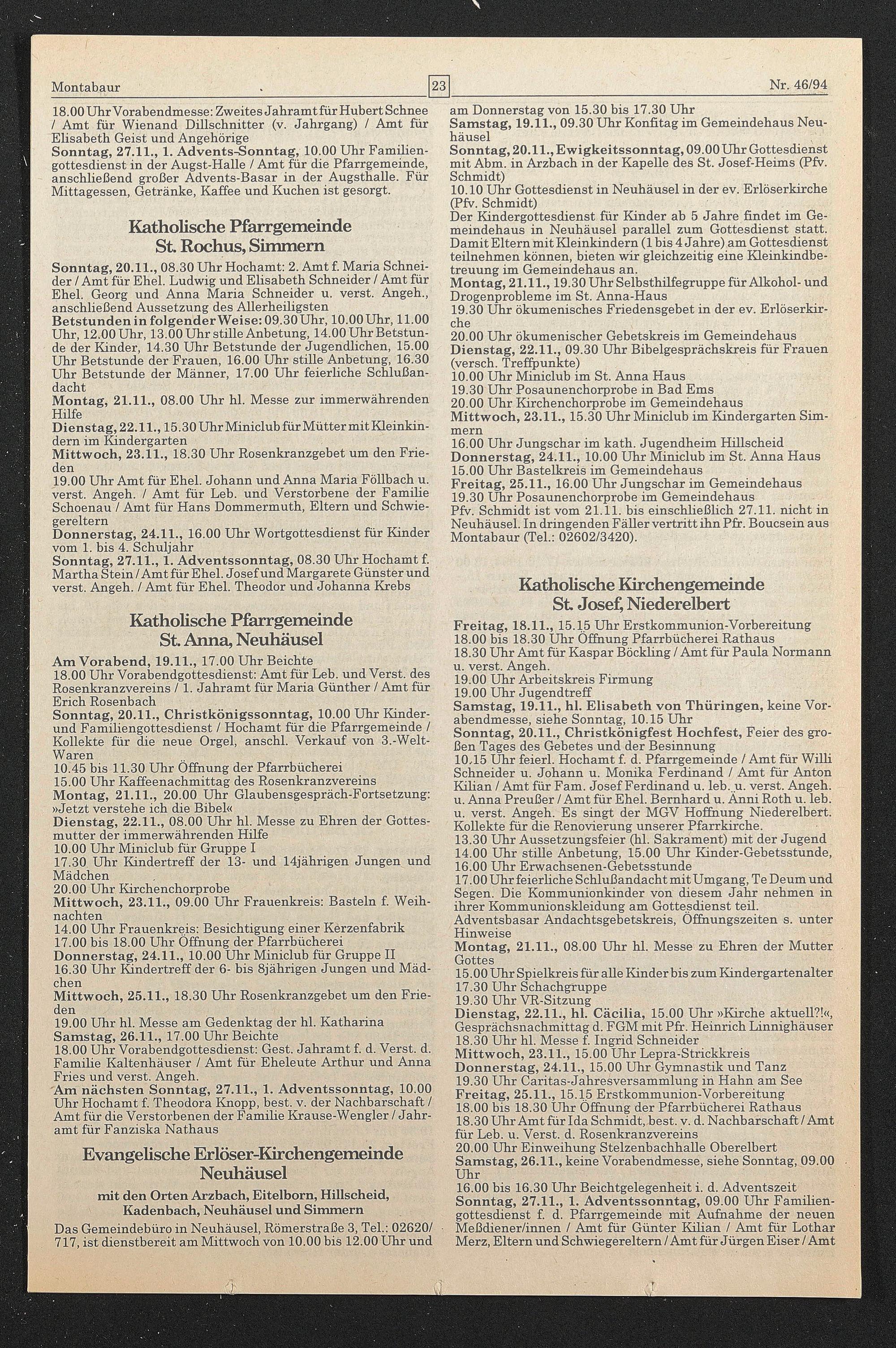 Sonntag, 20.11., 08.30 Uhr Hochamt: 2. Amt f. Maria Schneider / Amt für Ehel. Ludwig und Elisabeth Schneider / Amt für Ehel. Georg und Anna Maria Schneider u. verst. Angeh., anschließend Aussetzung des Allerheiligsten Betstunden in folgender Weise: 09.30 Uhr, 10.00 Uhr, 11.00 Uhr, 12.00 Uhr, 13.00 Uhr stille Anbetung, 14.00 Uhr Betstunde der Kinder, 14.30 Uhr Betstunde der Jugendlichen, 15.00 Uhr Betstunde der Frauen, 16.00 Uhr stille Anbetung, 16.30 Uhr Betstunde der Männer, 17.00 Uhr feierliche Schlußandacht
