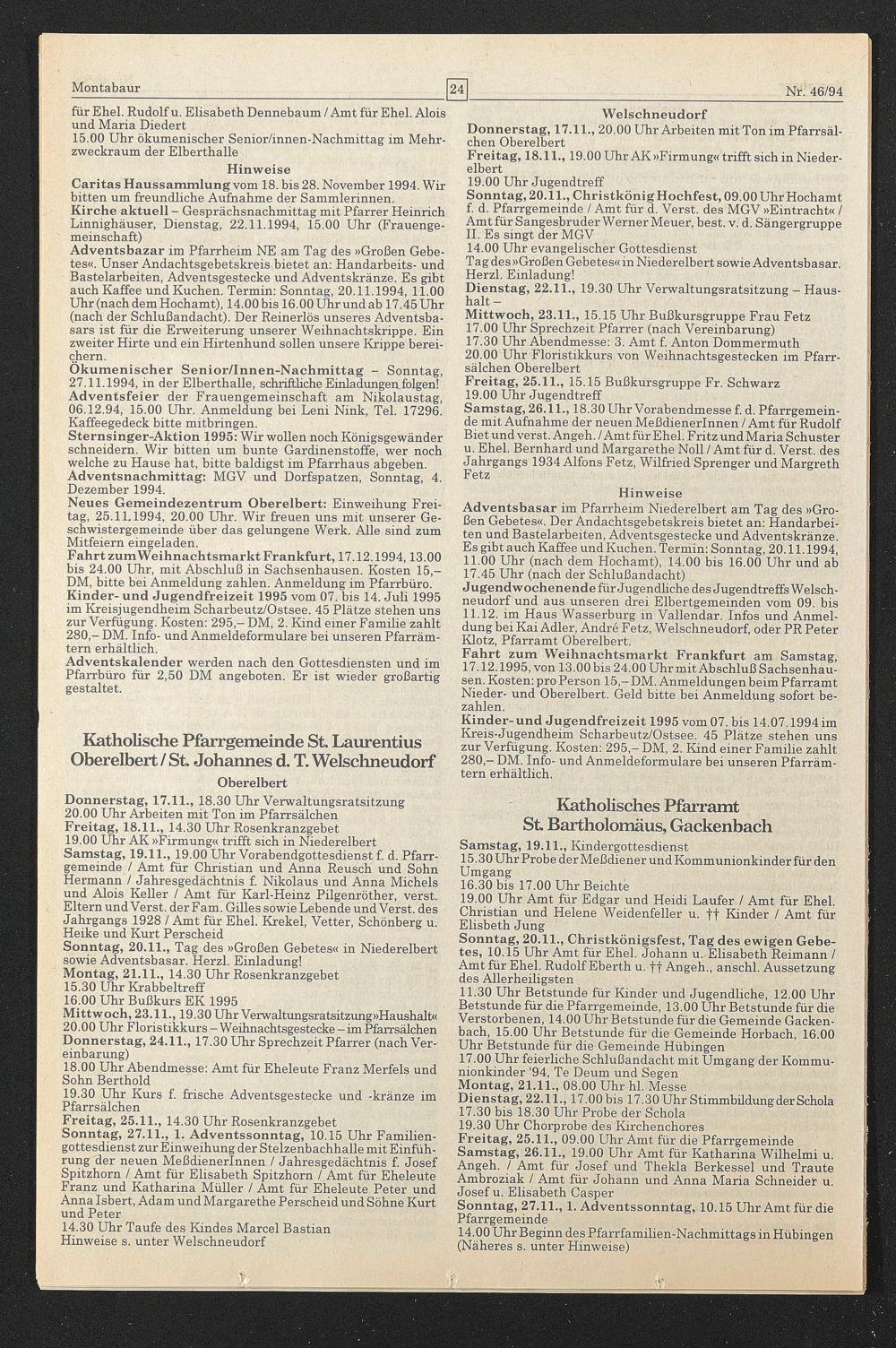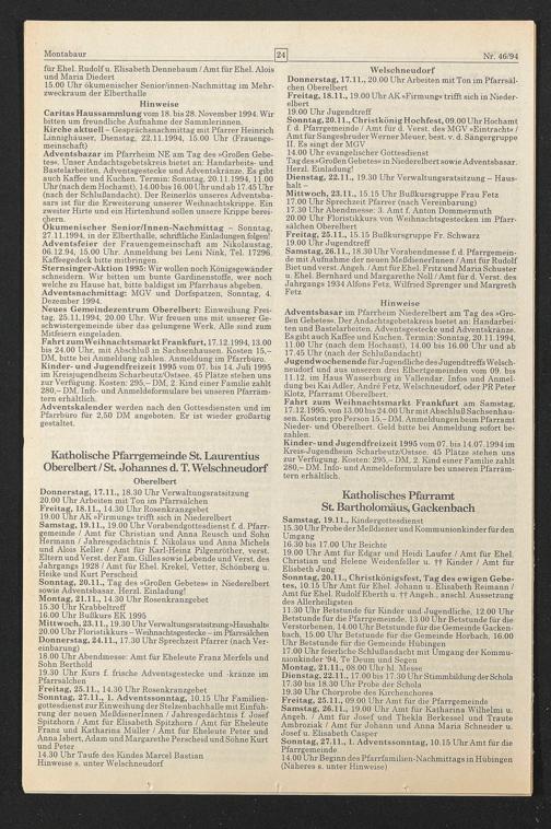 Ökumenischer Senior/Innen-Nachmittag - Sonntag, 27.11.1994, in der Elberthalle, schriftliche Einladungen folgen! Adventsfeier der Frauengemeinschaft am Nikolaustag, 06.12.94, 15.00 Uhr. Anmeldung bei Leni Nink, Tel. 17296. Kaffeegedeck bitte mitbringen.