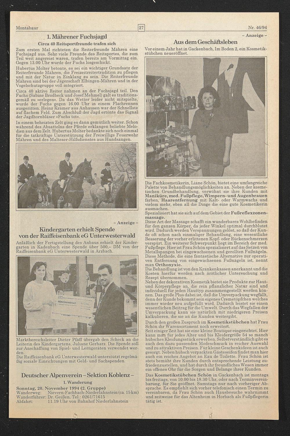 Anläßlich der Fertigstellung des Anbaus erhielt der Kindergarten in Kadenbach eine Spende über 500,— DM von der Raiffeisenbank eG Unterwesterwald in Arzbach.