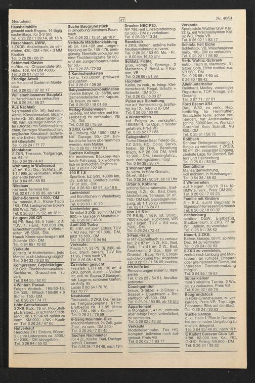 in Limburg, KM 1090,- DM + NK, Garage, 90,- DM, Einbauküche kann übernommen werden, kein Makler Tel. 0 26 02/18 07 31