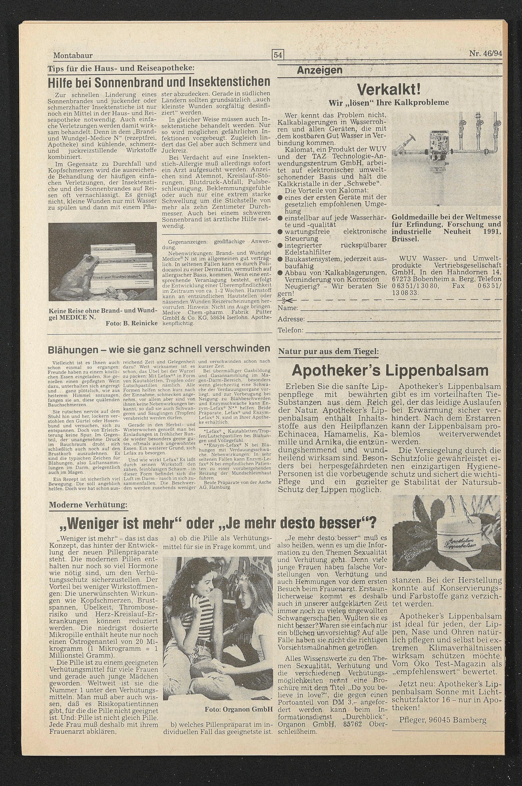 WUV Wasser- und Umwelt- produkte Vertfiebsgeseljschaft GmbH, In den Hahndomen 14, 67273 Bobenheim a. Berg, Telefon ■ 0 63 51/130 80, Fax 0 63 51/ 1308 33.