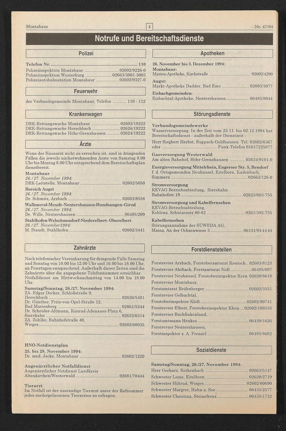 HNO-Notdienstplan 25. bis 28. November 1994: