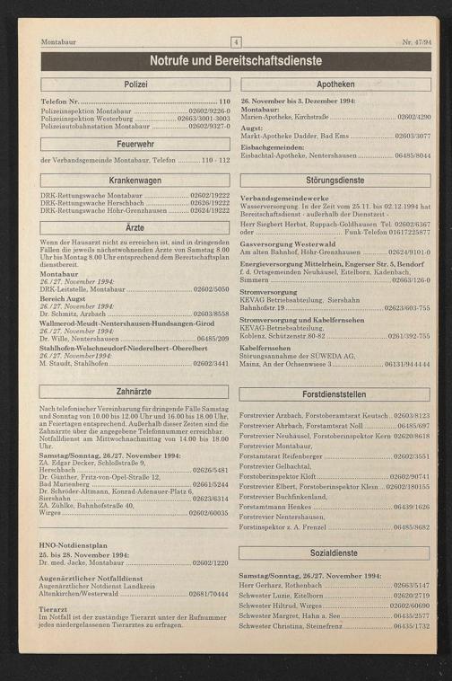 Wasserversorgung. In der Zeit vom 25.11. bis 02.12.1994 hat Bereitschaftsdienst - außerhalb der Dienstzeit -
