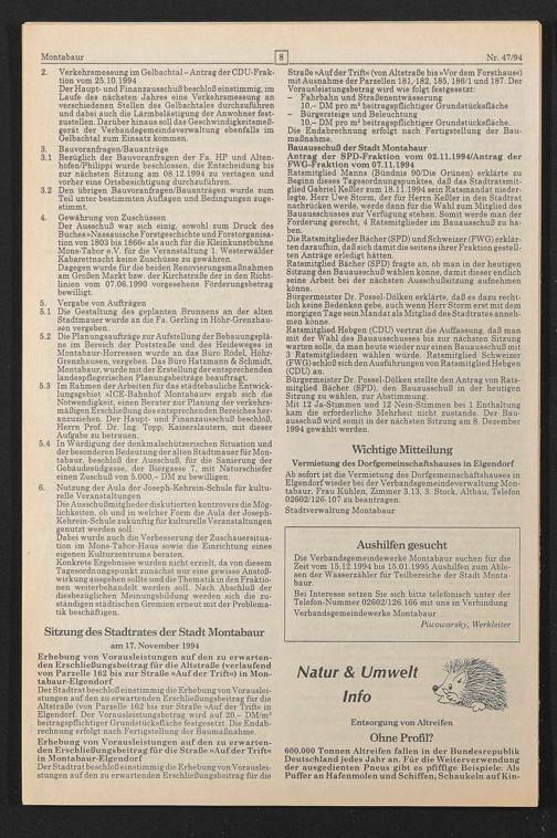 Antrag der SPD-Fraktion vom 02.11.1994/Antrag der FWG-Fraktion vom 07.11.1994