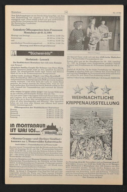 Am Samstag, dem 26. November, und am Sonntag, dem 27. November, können von 10.00 bis 18.00 Uhr in der Bürgerhalle (Rathaus) in Montabaur über 100 Krippen aus aller Welt bewundert werden. Gezeigt werden Krippen aus den verschiedensten Materialien und aus zwei Jahrhunderten, angefertigt von Künstlern, Laien und Schülern. Vorbereitet wird die Ausstellung von Schülern der Klassen 7a und 7 b der Freiherr vom Stein Schule Nentershausen.