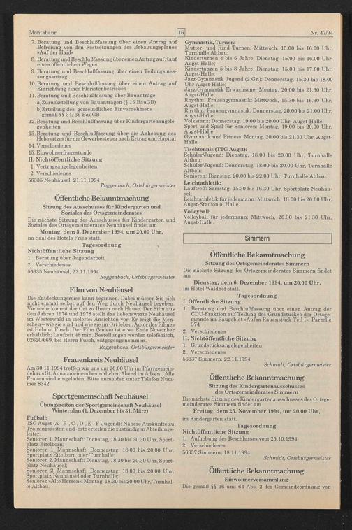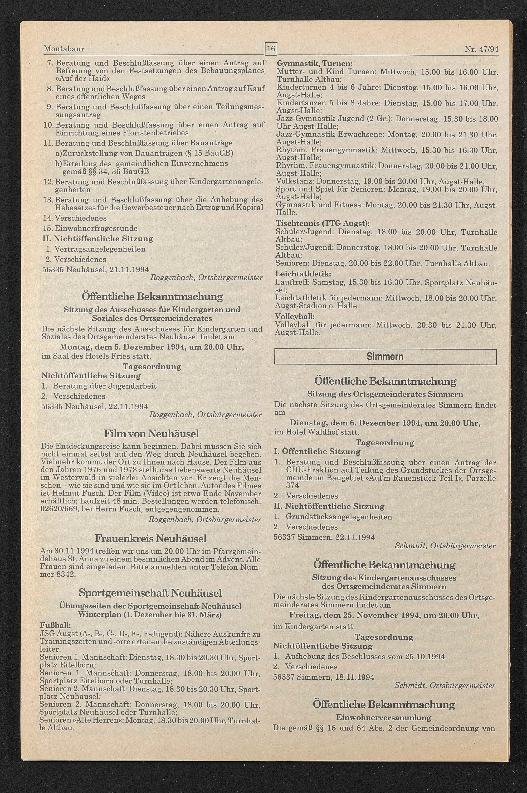 Die nächste Sitzung des Ausschusses für Kindergarten und Soziales des Ortsgemeinderates Neuhäusel findet am , Montag, dem 5. Dezember 1994, um 20.00 Uhr, im Saal des Hotels Fries statt.