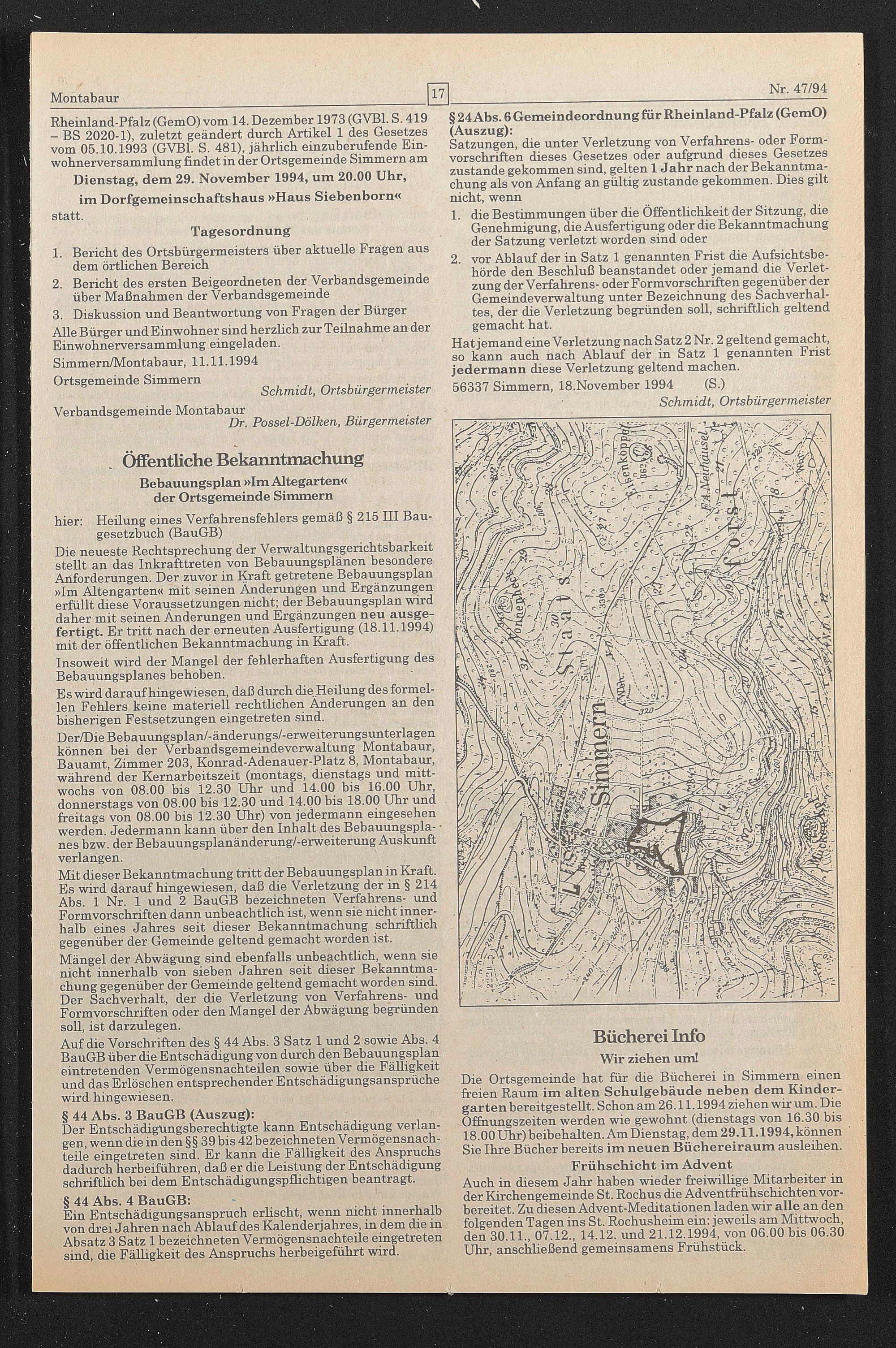 Rheinland-Pfalz (GemO) vom 14. Dezember 1973 (GVB1. S. 419 - BS 2020-1), zuletzt geändert durch Artikel 1 des Gesetzes vom 05.10.1993 (GVB1. S. 481), jährlich einzuberufende Einwohnerversammlung findet in der Ortsgemeinde Simmern am Dienstag, dem 29. November 1994, um 20.00 Uhr, im Dorfgemeinschaftshaus »Haus Siebenborn« statt.