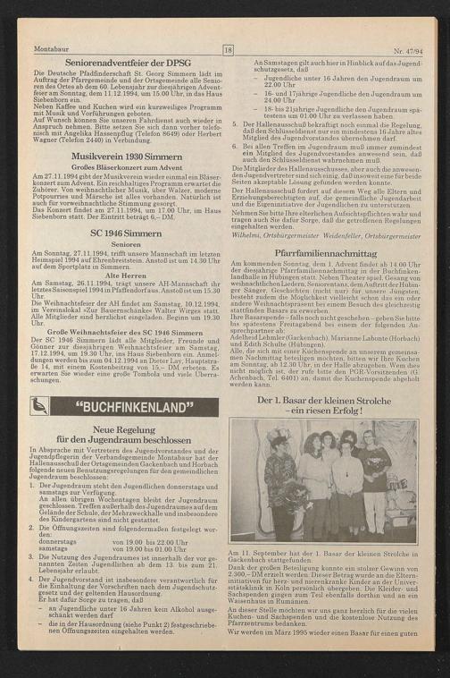 Die Deutsche Pfadfinderschaft St. Georg Simmern lädt im Auftrag der Pfarrgemeinde und der Ortsgemeinde alle Senioren des Ortes ab dem 60. Lebensjahr zur diesjährigen Adventfeier am Sonntag, dem 11.12.1994, um 15.00 Uhr, in das Haus Siebenborn ein.