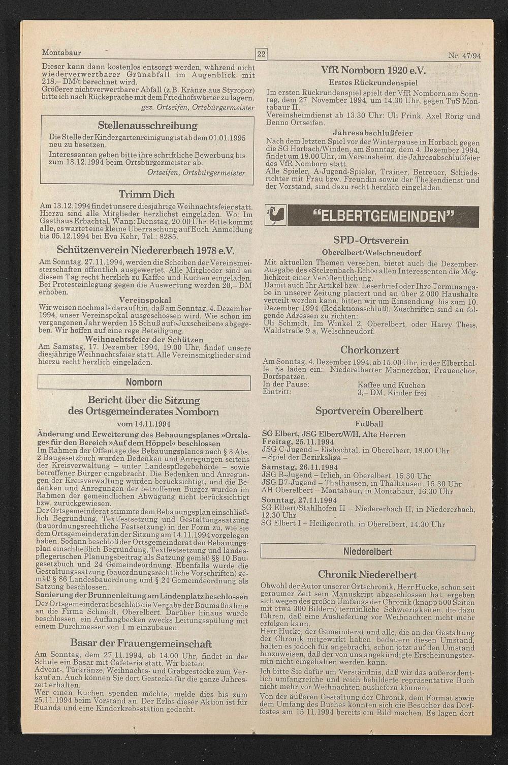 Bericht über die Sitzung des Ortsgemeinderates Nomborn vom 14.11.1994