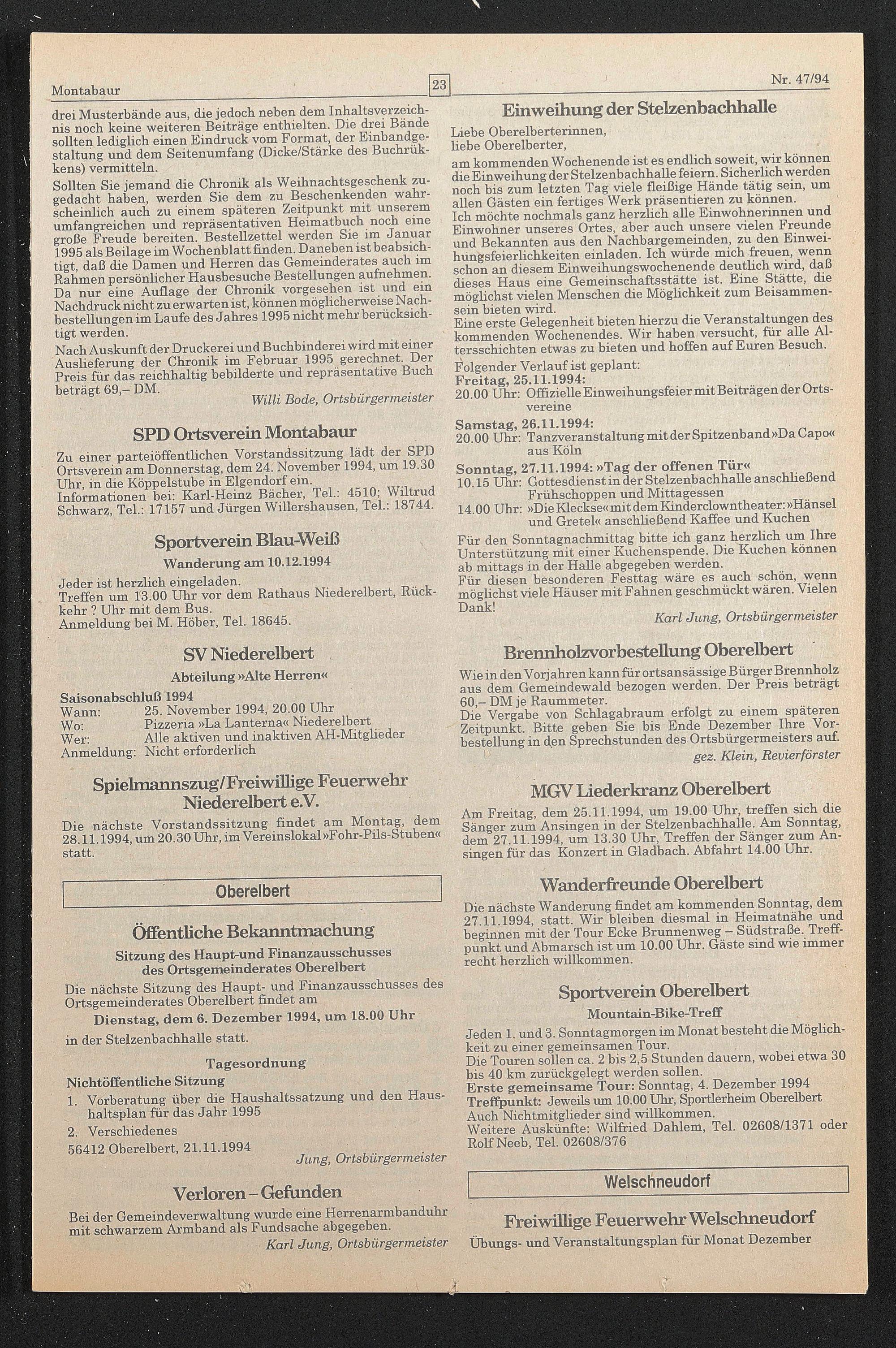 Am Freitag, dem 25.11.1994, um 19.00 Uhr, treffen sich die Sänger zum Ansingen in der Stelzenbachhalle. Am Sonntag, dem 27.11.1994, um 13.30 Uhr, Treffen der Sänger zum Ansingen für das Konzert in Gladbach. Abfahrt 14.00 Uhr.