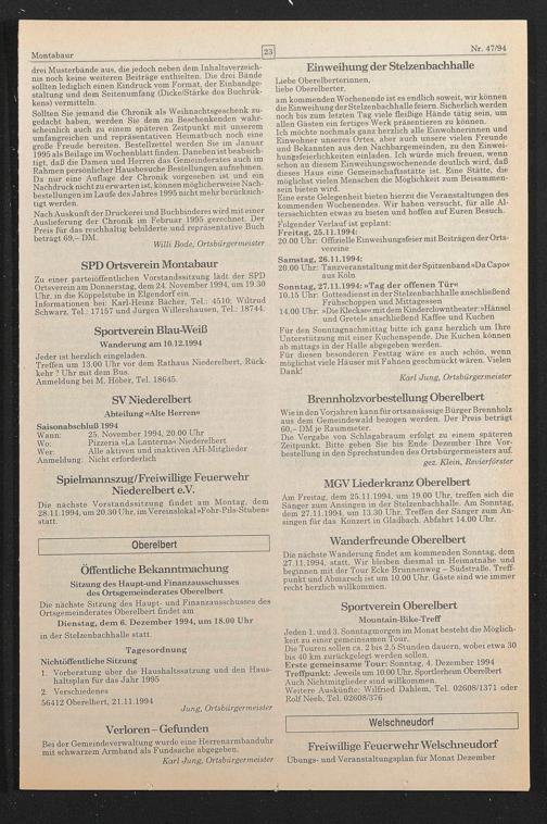 Nach Auskunft der Druckerei und Buchbinderei wird mit einer Auslieferung der Chronik im Februar 1995 gerechnet. Der Preis für das reichhaltig bebilderte und repräsentative Buch beträgt 69,- DM.