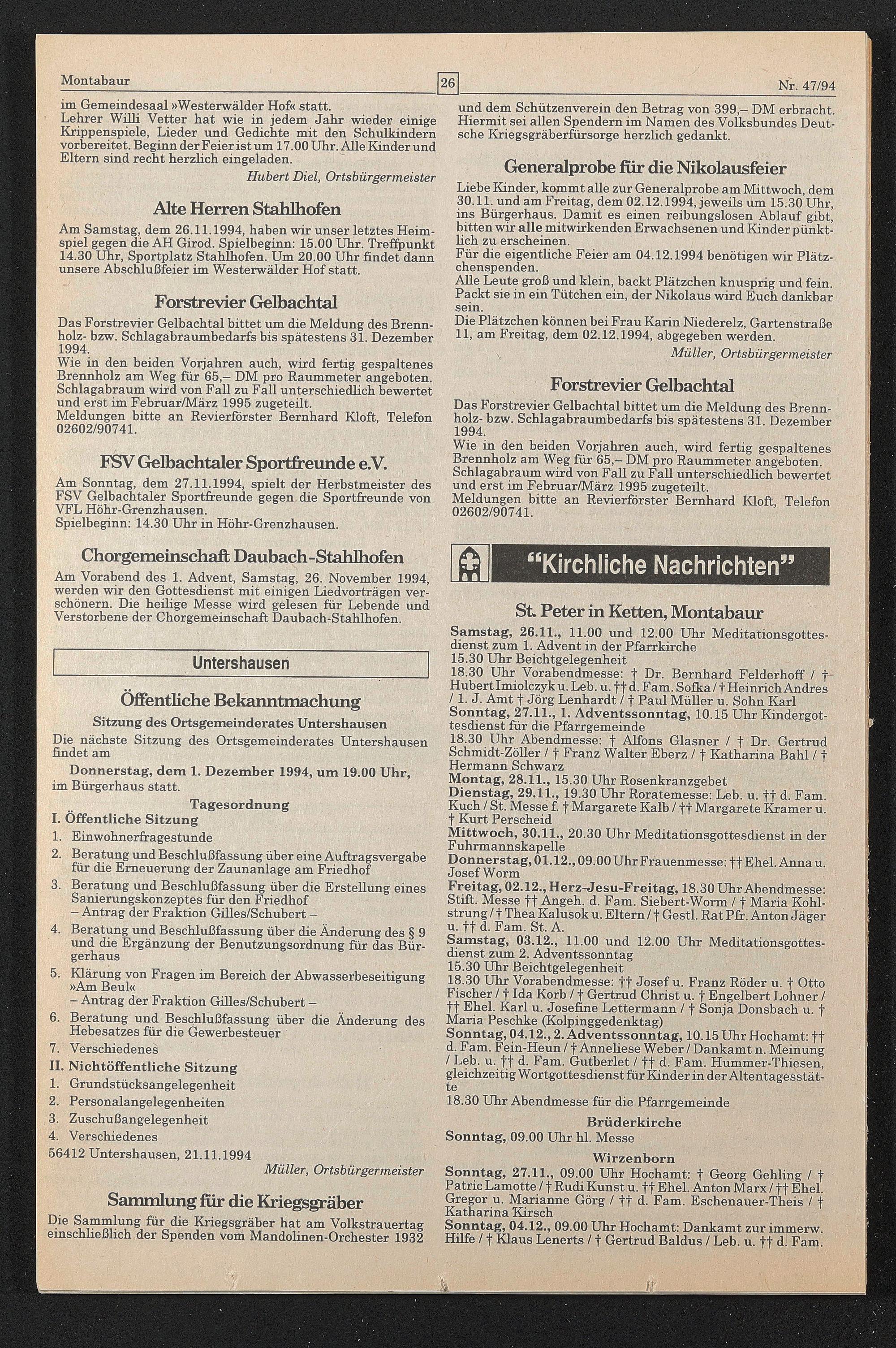 Am Vorabend des 1. Advent, Samstag, 26. November 1994, werden wir den Gottesdienst mit einigen Liedvorträgen verschönern. Die heilige Messe wird gelesen für Lebende und Verstorbene der Chorgemeinschaft Daubach-Stahlhofen.