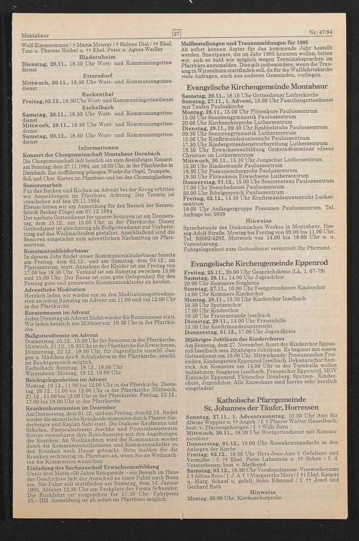 Konzert der Chorgemeinschaft Montabaur-Dernbach Die Chorgemeinschaft lädt herzlich ein zum diesjährigen Konzert am Sonntag, dem 27.11.1994, tun 16.00 Uhr, in der Pfarrkirche in Dernbach. Zur Aufführung gelangen Werke für Orgel, Trompete, Soli und Chor. Karten im Pfarrbüro und bei den Chormitgliedem. Seniorenarbeit
