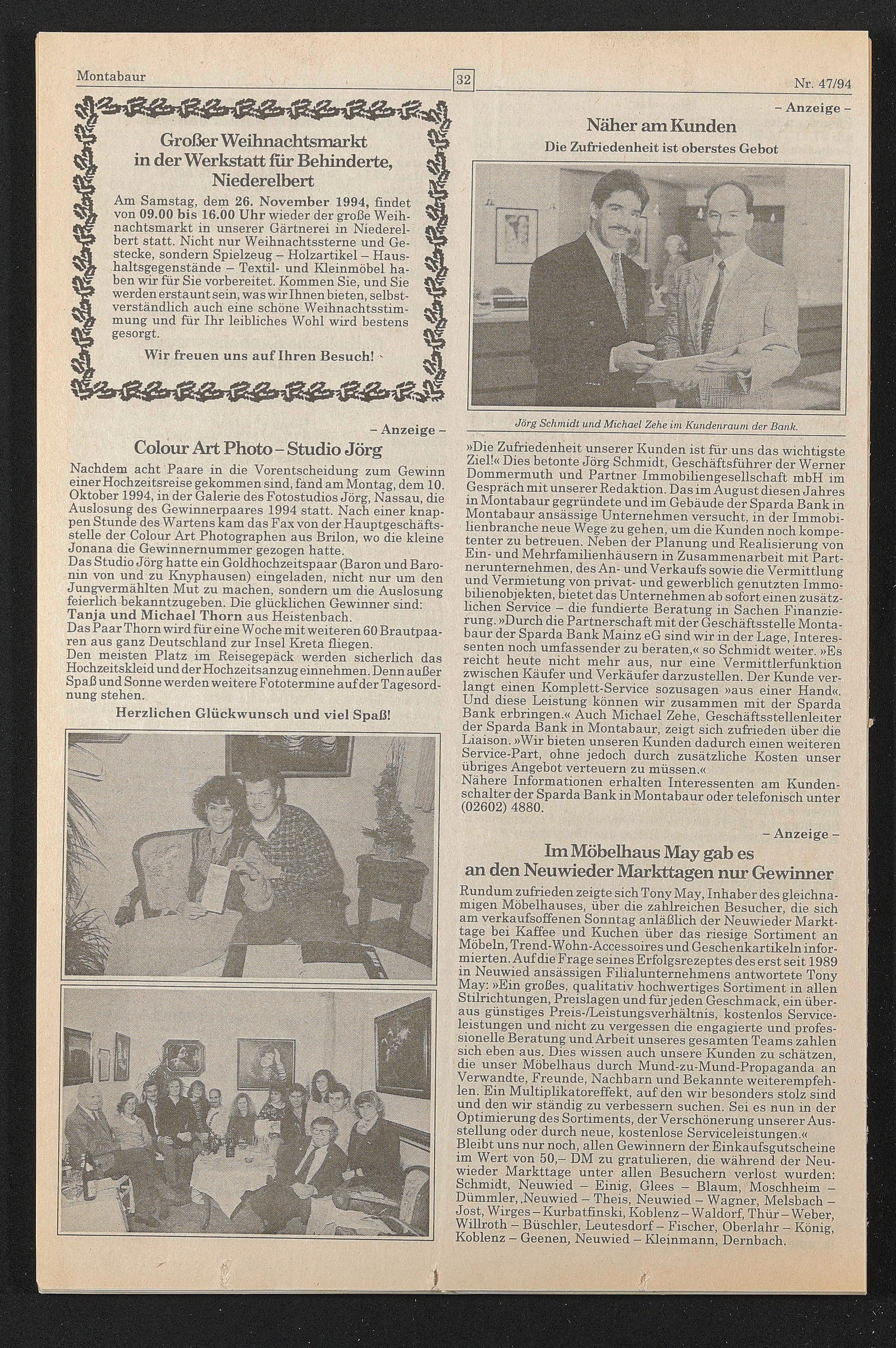 Nachdem acht Paare in die Vorentscheidung zum Gewinn einer Hochzeitsreise gekommen sind, fand am Montag, dem 10. Oktober 1994, in der Galerie des Fotostudios Jörg, Nassau, die Auslosung des Gewinnerpaares 1994 statt. Nach einer knappen Stunde des Wartens kam das Fax von der Hauptgeschäftsstelle der Colour Art Photographen aus Brilon, wo die kleine Jonana die Gewinnernummer gezogen hatte.