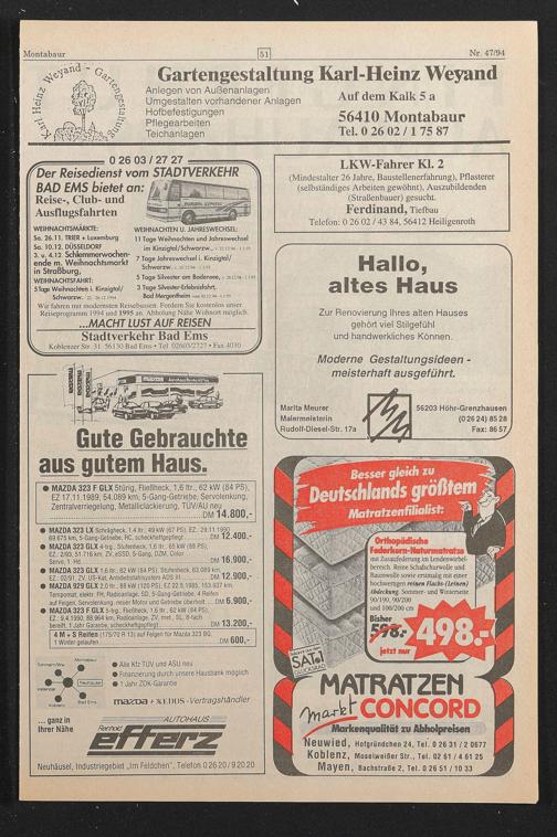 Tleuwied, Hofgründchen 24, Tel. 0 26 31 /2 0677 Koblenz, Moselweißer Str., Tel. 02 61 /4 61 25 Mayen, Bachstraße 2 , Tel. 0 26 51 /10 33