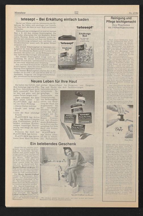 ' Noch unsere Großmütter kannten das wöchentliche Bad im hölzernen Waschzuber, im öffentlichen Badehaus oder zu Hause in einem „Badezimmer“ mit mühevoll geheiztem Ofen. Auf jeden Fall war die „große Wäsche" eine Familienprozedur. Die .„Reinigung“ stand im Vordergrund, und Dinge wie „Pflege“ und „Ansprüche an eine Seife“ waren nebensächlich.