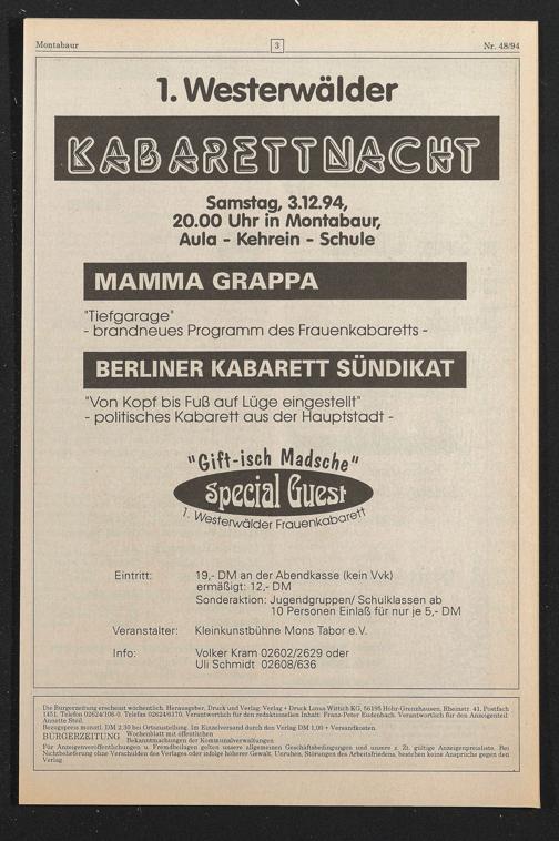 Samstag, 3.12.94, 20.00 Uhr in Montabaur, Aula - Kehrein - Schule