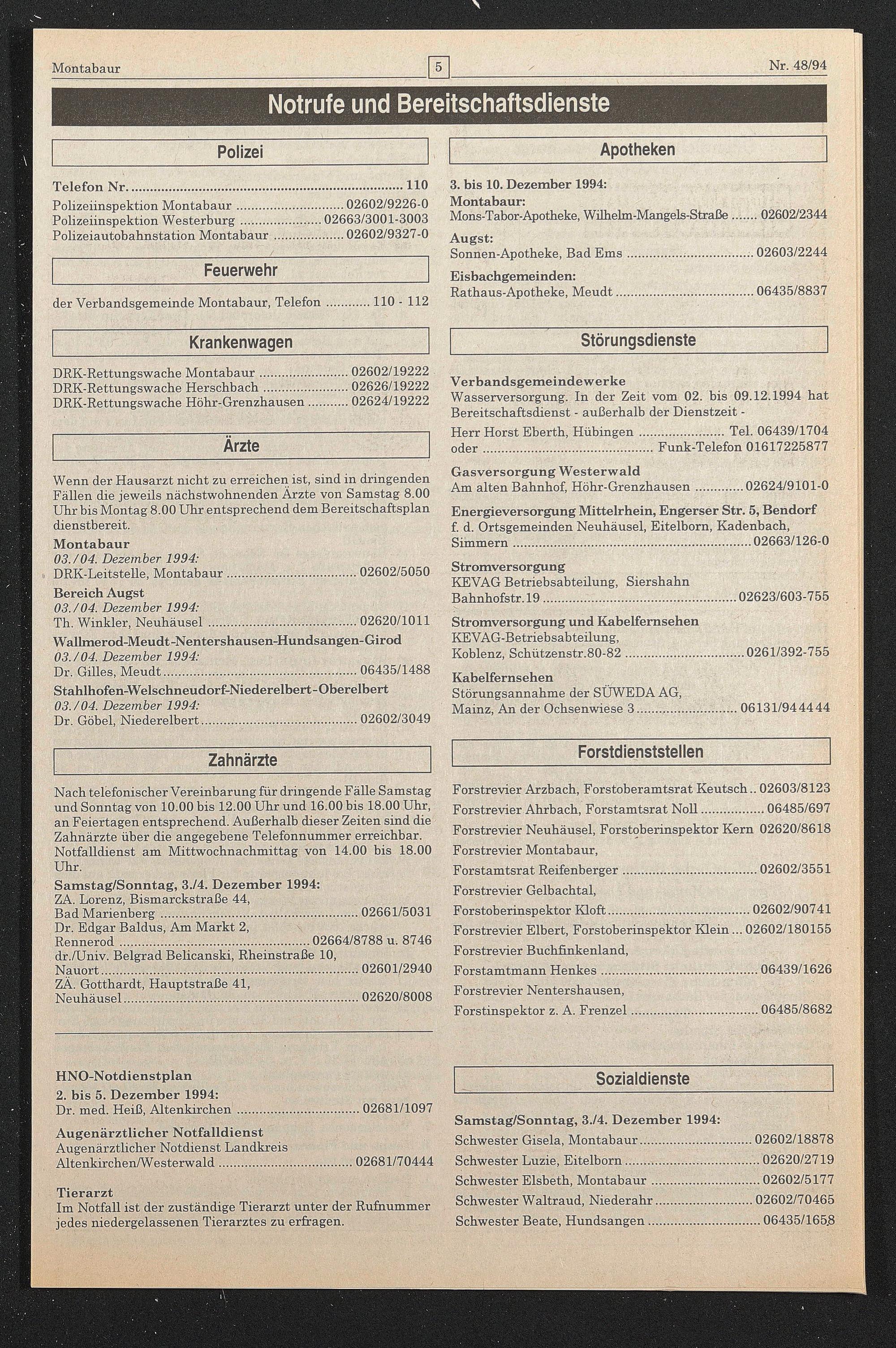 HNO-Notdienstplan 2. bis 5. Dezember 1994: