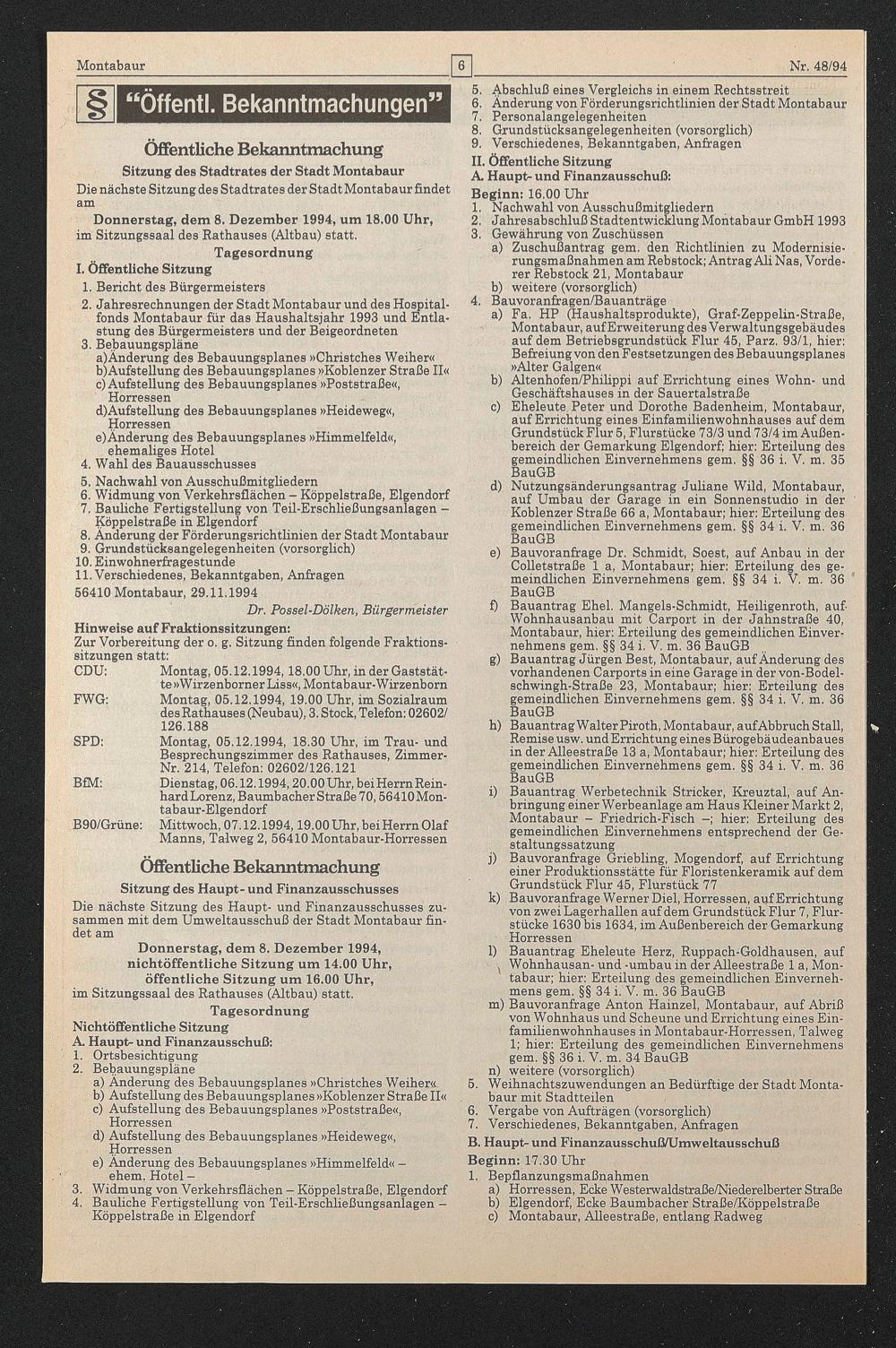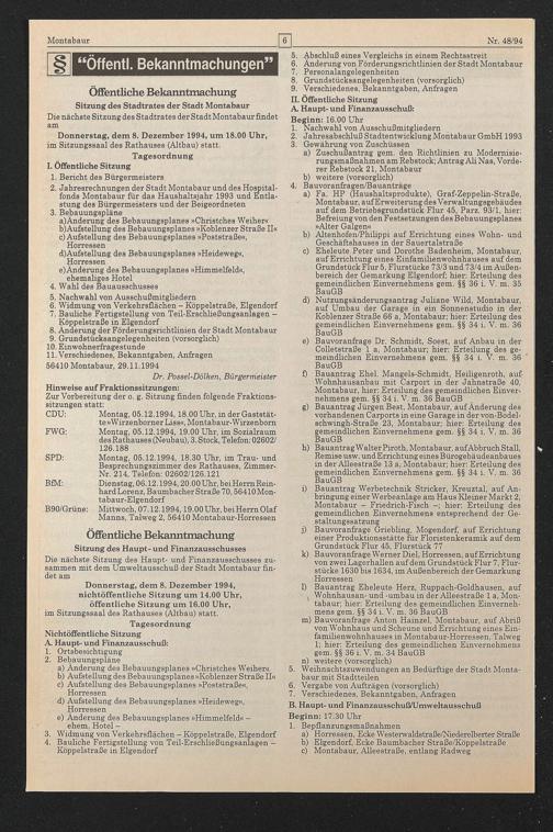 Besprechungszimmer des Rathauses, Zimmer- Nr. 214, Telefon: 02602/126.121 BfM: Dienstag, 06.12.1994,20.00 Uhr, beiHerrn Rein-