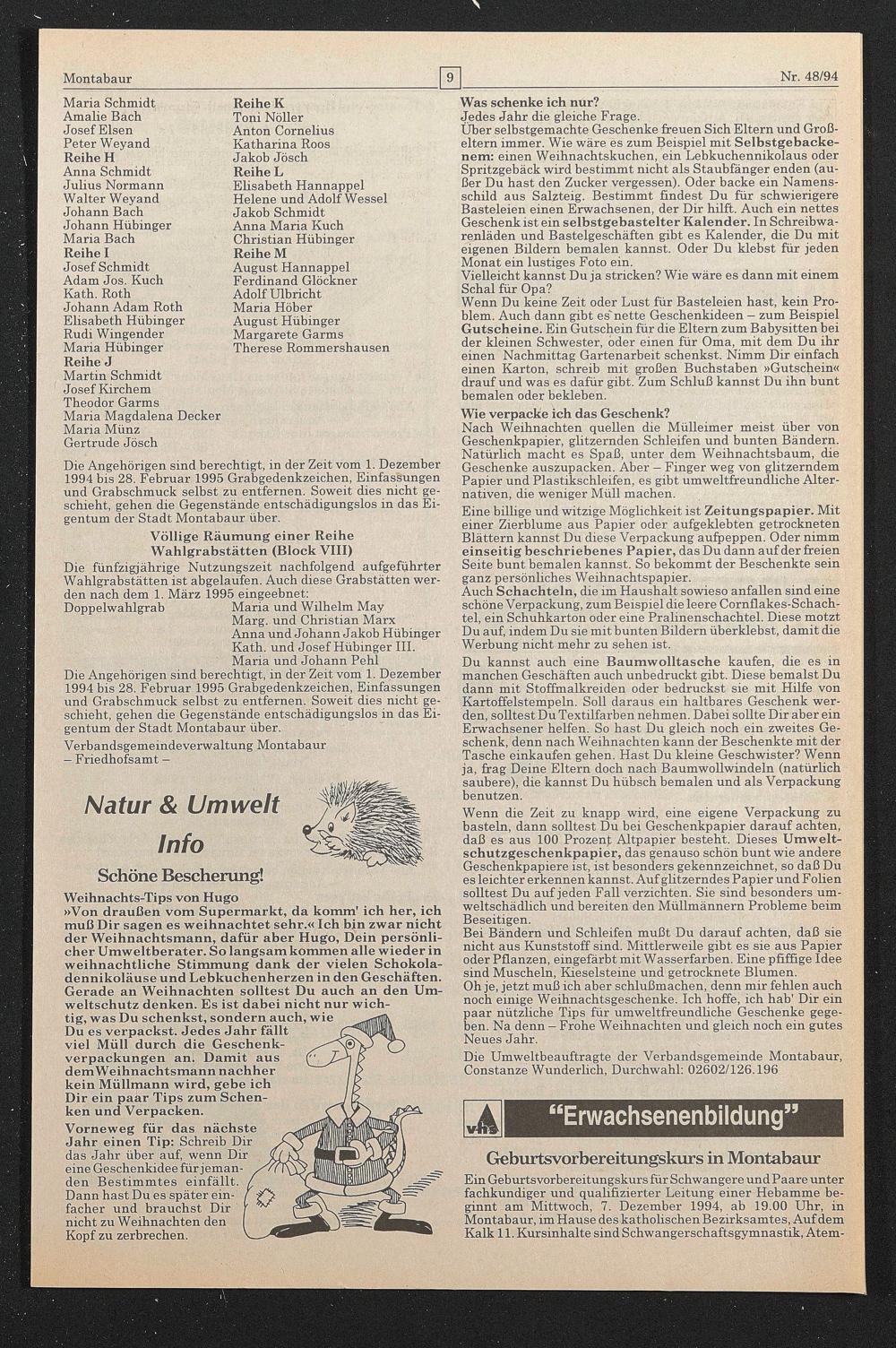 Ein Geburtsvorbereitungskurs für Schwangere und Paare unter fachkundiger und qualifizierter Leitung einer Hebamme beginnt am Mittwoch, 7. Dezember 1994, ab 19.00 Uhr, in Montabaur, im Hause des katholischen Bezirksamtes, Auf dem Kalk 11. Kursinhalte sind Schwangerschaftsgymnastik, Atem-
