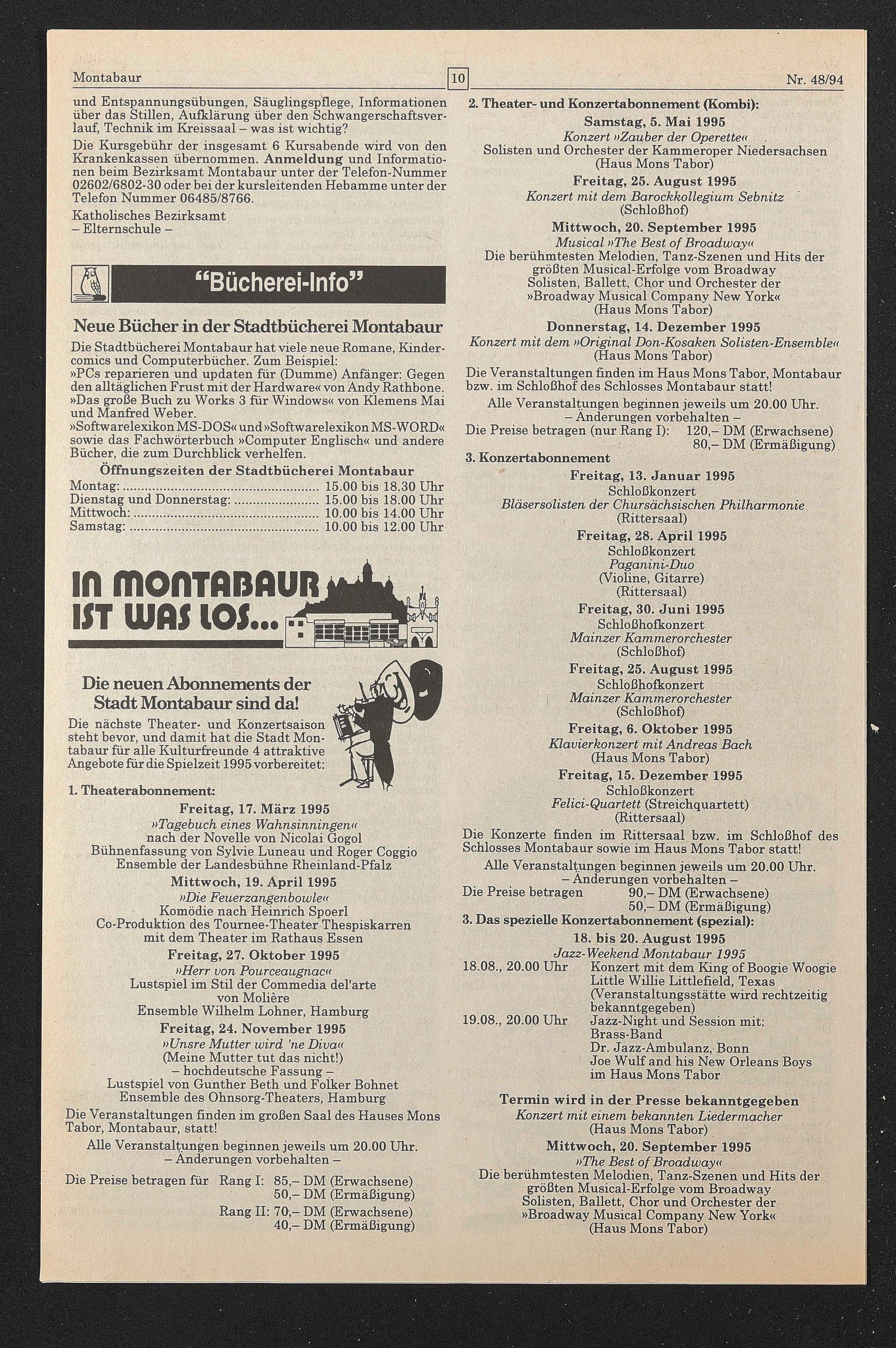 Die nächste Theater- und Konzertsaison steht bevor, und damit hat die Stadt Montabaur für alle Kulturfreunde 4 attraktive Angebote für die Spielzeit 1995 vorbereitet: