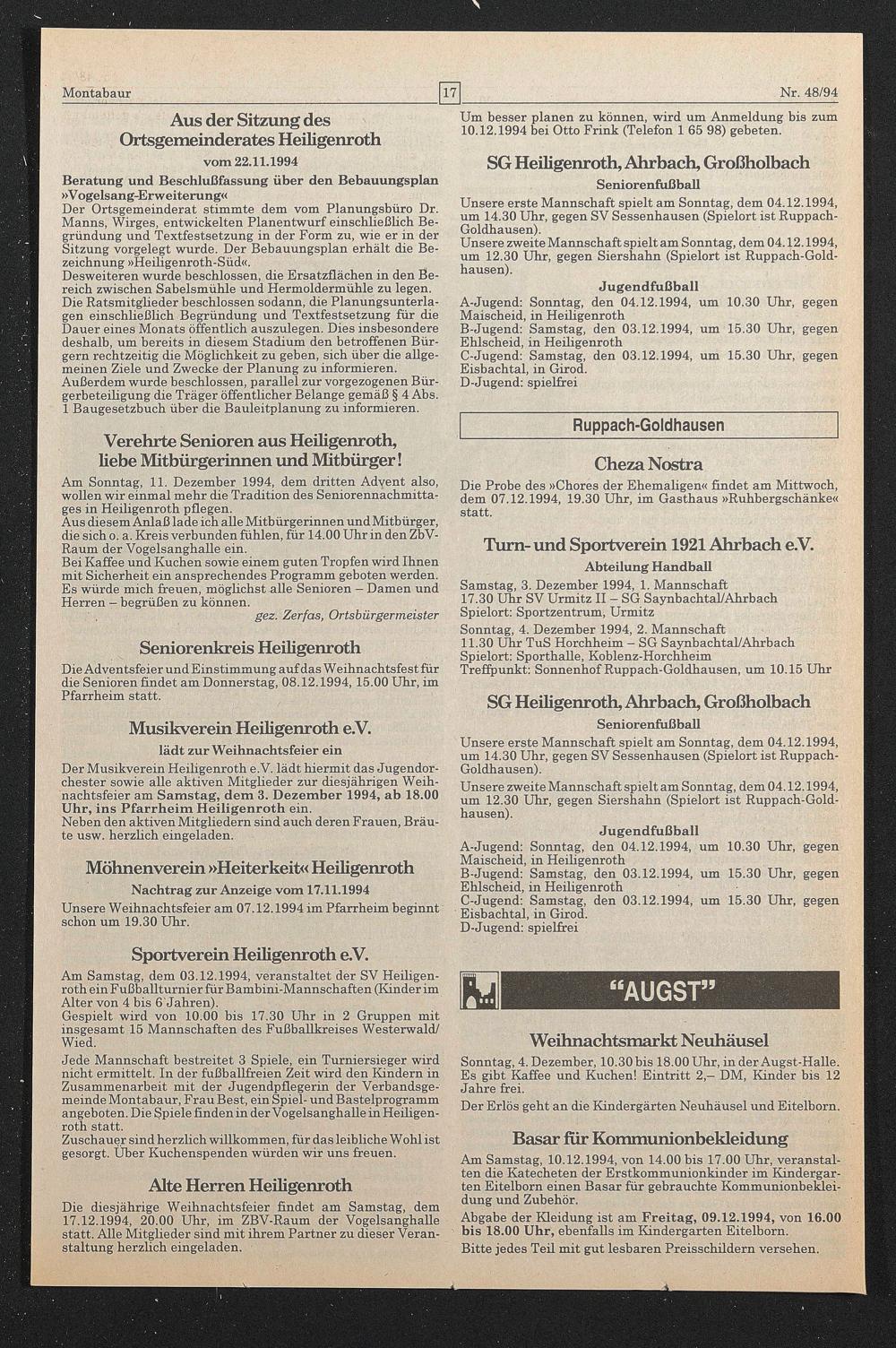 Der Musikverein Heiligenroth e.V. lädt hiermit das Jugendorchester sowie alle aktiven Mitgheder zur diesjährigen Weihnachtsfeier am Samstag, dem 3. Dezember 1994, ab 18.00 Uhr, ins Pfarrheim Heiligenroth ein.