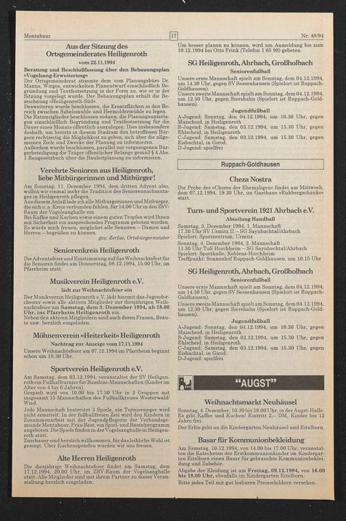 Am Sonntag, 11. Dezember 1994, dem dritten Adyent also, wollen wir einmal mehr die Tradition des Seniorennachmittages in Heiligenroth pflegen.