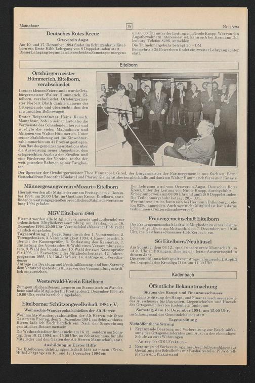 Hiermit werden alle Mitglieder zur am Freitag, dem 2. Dezember 1994, um 20.00 Uhr, im Gasthaus Krone, Eitelborn, stattfindenden satzungsgemäßen ordentlichen Mitgliederversammlung 1994 geladen.