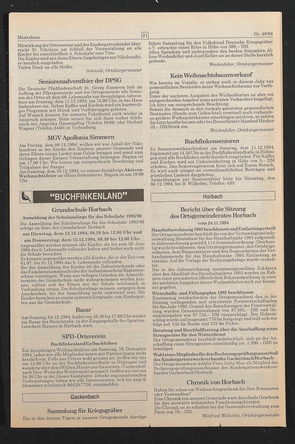 Haushaltsrechnung1993 beschlossen undEntlastung erteilt Der Ortsgemeinderat beschloß die von der Verbandsgemeindeverwaltung Montabaur für das Haushaltsjahr 1993 aufgestellte Jahresrechnung gemäß § 114 Gemeindeordnung. Gleichzeitig wurde beschlossen, dem Ortsbürgermeister, den Ortsbeigeordneten, dem Bürgermeister und den Beigeordneten der Verbandsgemeinde für das Haushaltsjahr 1993 Entlastung zu erteilen. Auf die Vorlage der Rechnungsbelege wurde verzichtet.
