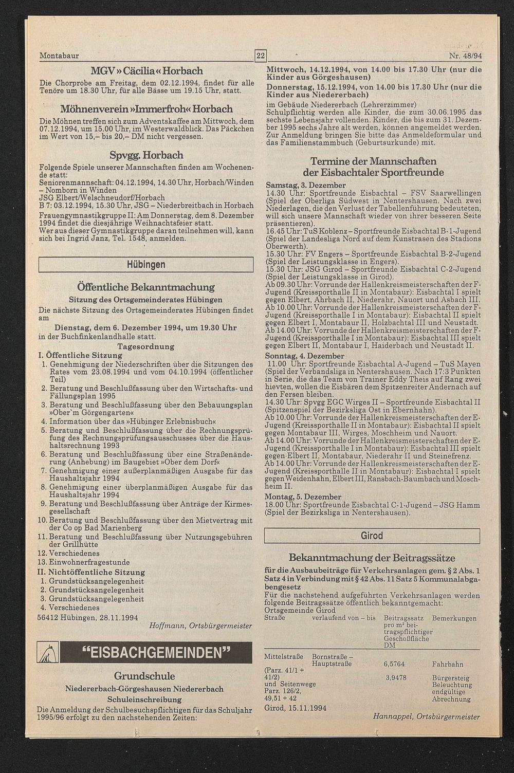 B 7:03.12.1994,15.30 Uhr, JSG - Niederbreitbach in Horbach Frauengymnastikgruppe II: Am Donnerstag, dem 8. Dezember 1994 findet die diesjährige Weihnachtsfeier statt.