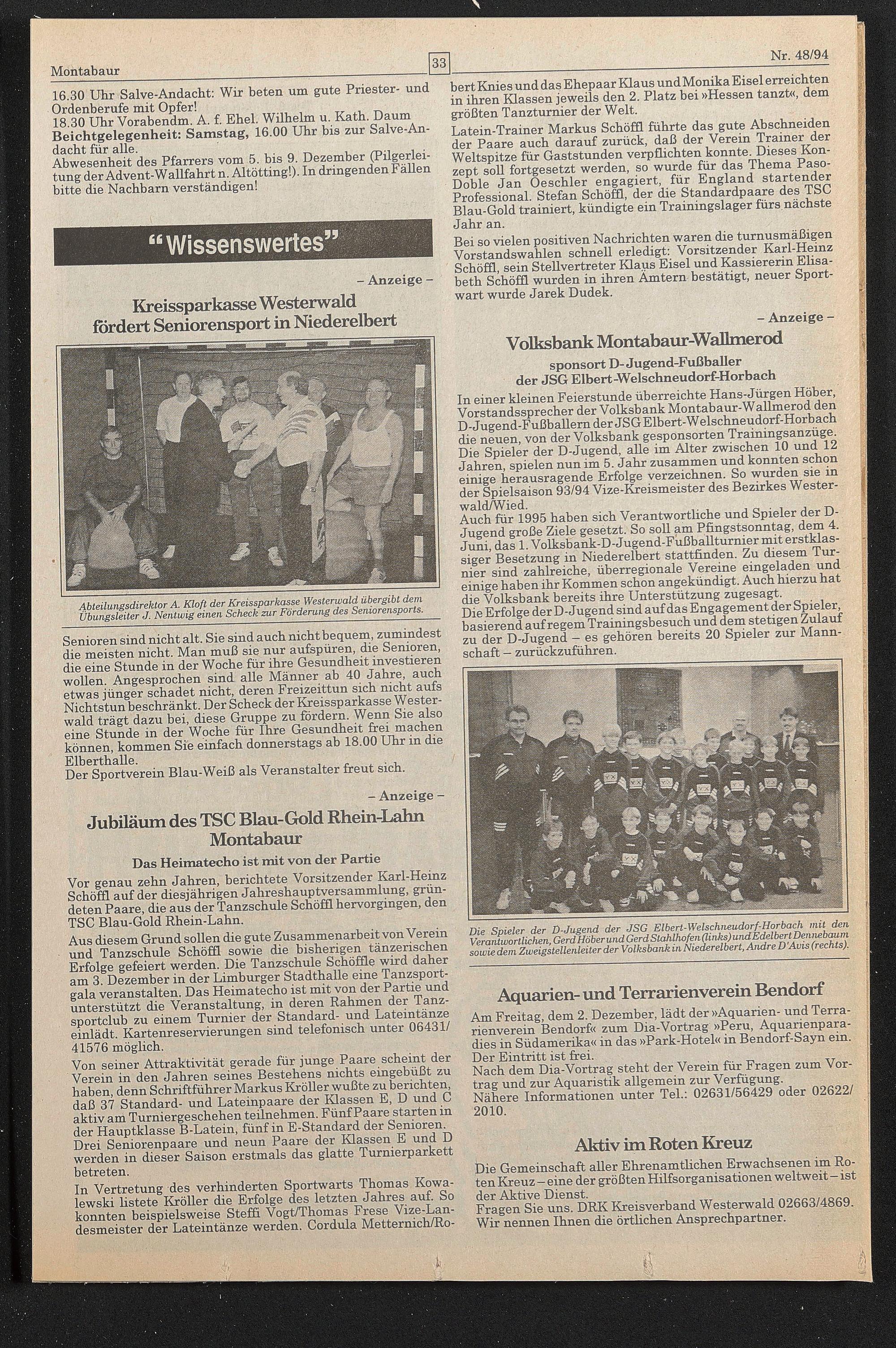 In einer kleinen Feierstunde überreichte Hans-Jürgen Höher, Vorstandssprecher der Volksbank Montabaur-Wallmerod den D-Jugend-Fußballern der JSGElbert-Welschneudorf-Horbach die neuen, von der Volksbank gesponserten Trainingsanzüge. Die Spieler der D-Jugend, alle im Alter zwischen 10 und 12 Jahren, spielen nun im 5. Jahr zusammen und konnten schon einige herausragende Erfolge verzeichnen. So wurden sie in der Spielsaison 93/94 Vize-Kreismeister des Bezirkes Westerwald/Wied.