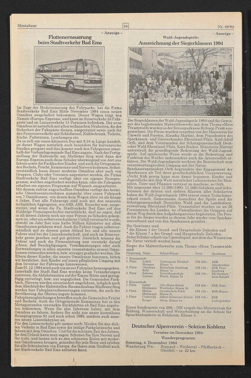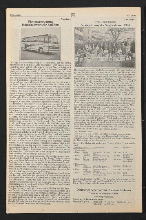 Zum 01.12.1994 wird auch ein neuer Fahrplan herausgegeben. Innerhalb der Stadt Bad Ems werden keine Veränderungen eintreten, die Abfahrtszeiten auf der Emser Hütte sind geringfügig vorverlegt, bzw-. nur angeglichen. Die Gemeinden Fachbach, Nievern werden unverändert angefahren, lediglich nach dem Abschluß der Haltesteilen-Baumaßnahme Miellener Steg werden hier Fahrplanverbesserungen eintreten, die auch der Bevölkerung der Oberau zugute kommen. Fahrplanangleichungen betreffen auch die Gemeinden Frücht und Becheln. Auch die Ortsgemeinde Kemmenau hat in den Mittagsstunden verstärkte Rückfahrten ab Bad Ems angebo- ten bekommen. Wenn Sie also Interesse haben, mit dem Omnibus zu fahren, fordern Sie nicht nur unser kostenloses Reiseprogramm 94 und auch schon 1995, sondern auch unseren neuen Linienfahrplan an.