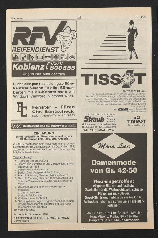 Zur 98. ordentlichen Generalversammlung für das Geschäftsjahr 1993 am Dienstag, 13. Dezember 1994, 20.00 Uhr, in der Limeshalle in Arzbach, laden wir alle Mitglieder herzlich ein.