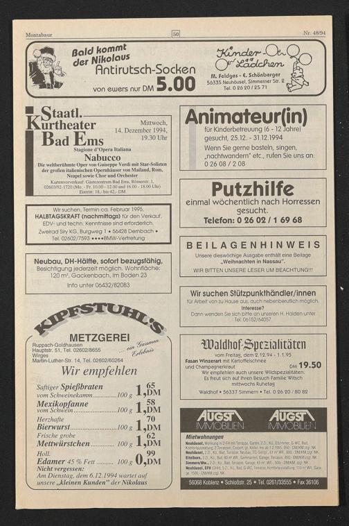 Kartenvorverkauf: Gästezentrum Bad Ems, Römerstr. 1, 02603/92-1720 (Mo. - Fr. 10.00 - 12.00 und 16.00 - 18.00 Uhr) Eintritt: 18,- bis 42,- DM