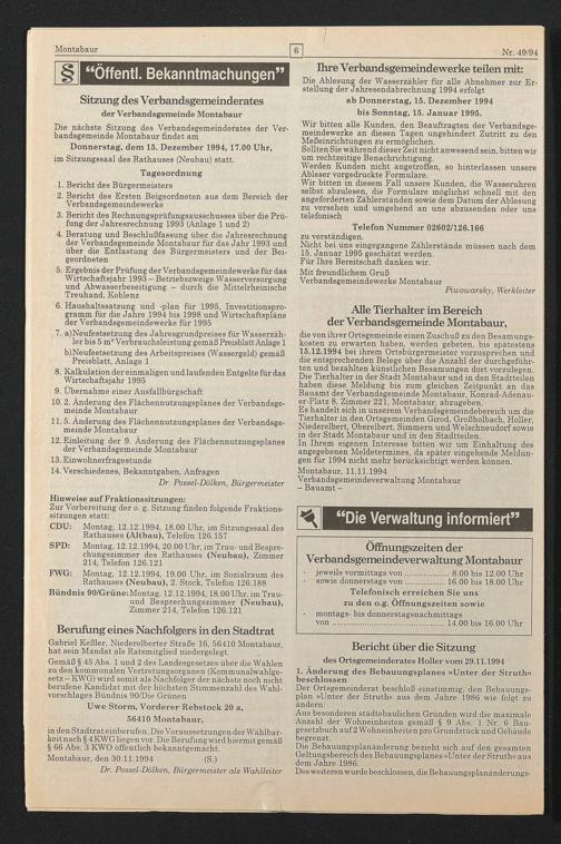 CDU: Montag, 12.12.1994, 18.00 Uhr, im Sitzungssaal des Rathauses (Altbau), Telefon 126.157 SPD: Montag, 12.12.1994,20.00 Uhr, im Trau-und Besprechungszimmer des Rathauses (Neubau), Zimmer 214, Telefon 126.121